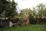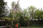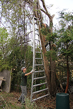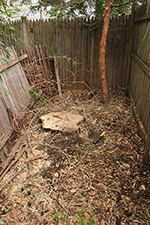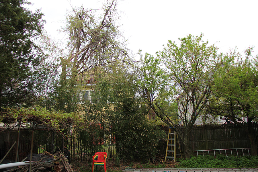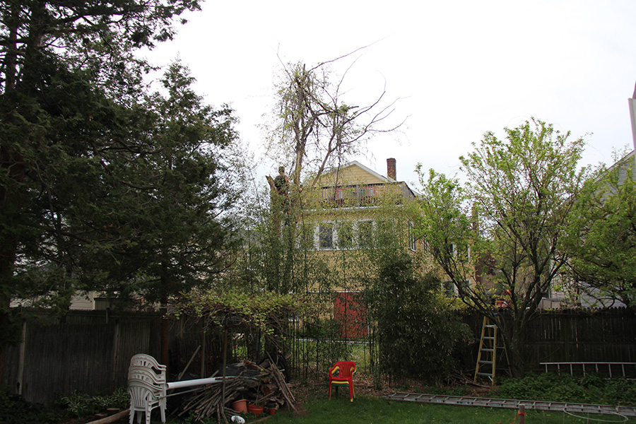 it took about 2 hours for them to chop down the tree. normally todd climbs the trees but he hurt his back exercising so the tattoo guy was the designated climber. given its location, the tree was pretty easy to fell, but the tangle of wisteria vines created unexpected results when branches came down still swinging. although i told them they could, i was still dismayed when they needlessly chopped down a bunch of bamboos that served as a screen so we could get some privacy from the upper floors of our backyard neighbor's house. my father gave todd a $800 check, they put back the fence, and then they left.