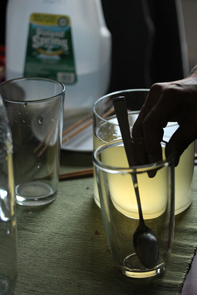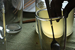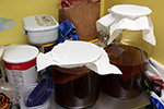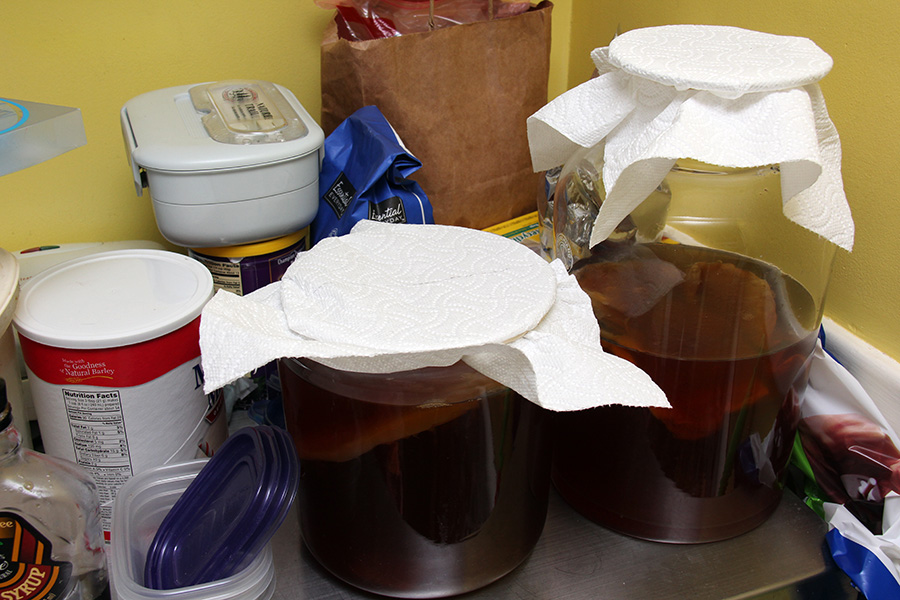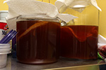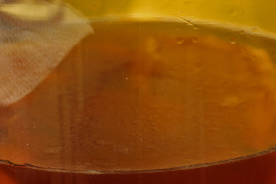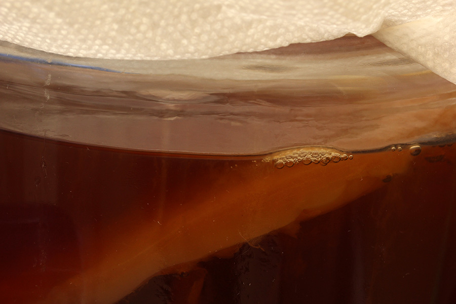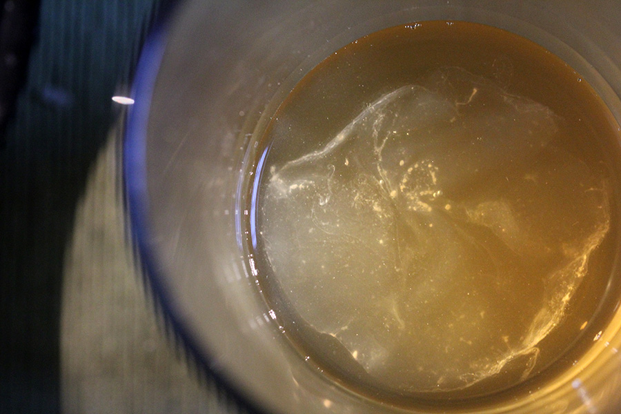 another day of kombucha fermentation. a layer of semi-transparent jelly has formed on the surface of both jars of tea. the smell is a little stronger too, like being in a brewery (from the yeast) but also at the same time the strong odor of vinegar (acetic acid made by the bacterias). my father was going to mix the bottled leftover kombucha juice to drink with some sugared jasmine tea, but when i checked the bottle, he noticed there was a new baby scoby already forming on the surface! so instead he brewed a small batch of sweetened oolong tea cooled down with some cold spring water and combined with the small scoby and leftover kombucha juices into a small glass jar (1/3 gallon).