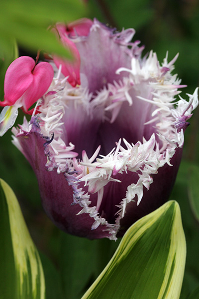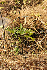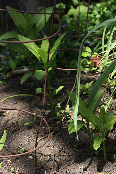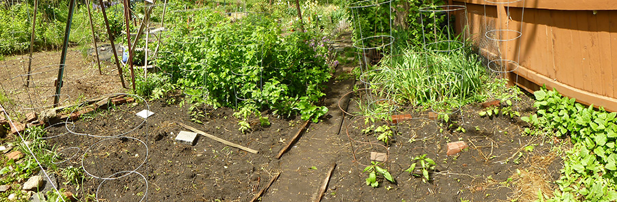 i was eager to go down to the community garden and check up on the status of my tomato plants after last night's mid-may frost warning. so after lunch, after planting my surplus hosta (in the back, near the sheep laurel bush) and irises (in the front), i went down to the garden with my spare tomato cage.