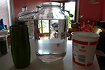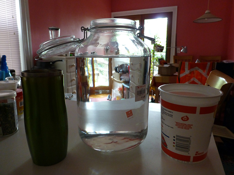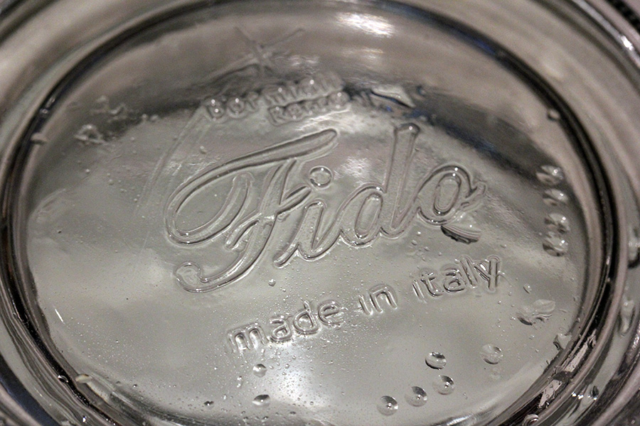 back at home, i used one of the quart-sized empty yogurt containers to fill up the fido glass jars. i knew from the first quart of water that it was at least a gallon. even when filled to a gallon, there's still enough room on top for another quart (although it'd probably be too full). so i'm assuming this is a 4-liter glass jar, which is perfect. the locking lid is also good if i want to do some anaerobic fermentation (e.g. carbonation), but just as easy to remove (the wire hinges can all be removed). i noticed a fork and wine glass symbol, which is an international mark for food safe containers.