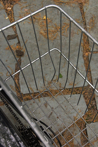 since it wasn't raining just yet, i decided to give my chain a thorough cleaning by removing it from the bike and soaking it in some degreasing solution. i cleaned it in the kitchen sink with an old toothbrush, and managed to get some grease splatters on my t-shirt (it was an old t-shirt anyway). i also fixed the bent wire on one of my rear baskets. i tried banging it back into place with a hammer but that didn't seem to work. finally i realized i could just bend it back with my bare hands.