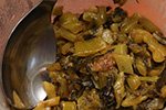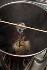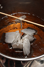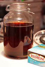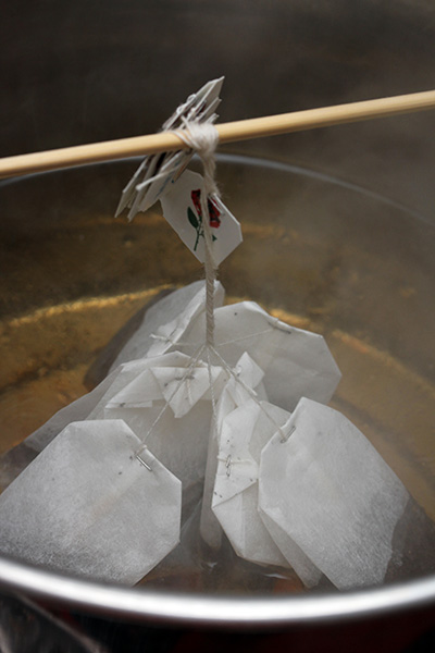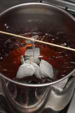 i grabbed a stock pot, poured in the supposedly 1 gallon of water that i had in my large glass jar, and fired up the stove. i devised a way to steep the teabags (8) by tying them to a long bamboo skewer and suspending them in the boiling water. i also added a cup of sugar.