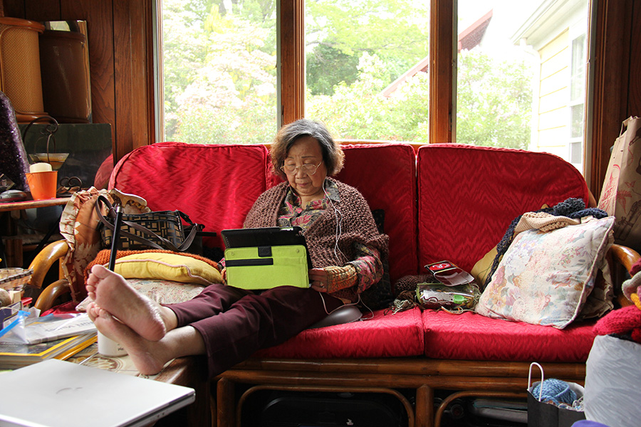 with her bad feet, my grandmother can't really go anywhere these days. my mother was in the sunroom chatting with her, showing her all the things she's knitted/crocheted, and then putting on some korean soap opera on the ipad for her to watch. later they watched a dvd on the laptop of my grandmother's 80th birthday spent in taiwan 6 years ago.