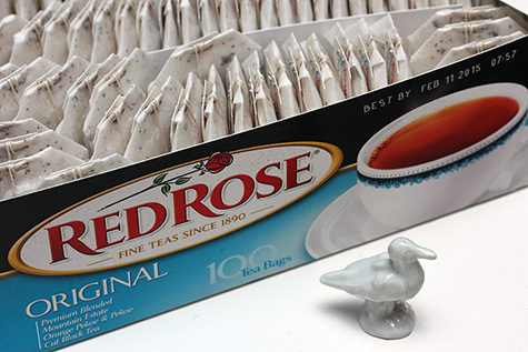 so here's something cool about red rose tea: they're like crackerjacks, each box comes with a little toy in the form of a miniature glazed ceramic figurine. over the years the trinkets change; the current series is nautical wonderland. i got a porcelain seagull (i would've preferred the diver's helmet or the seahorse or the mermaid).