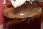 the new scoby growing in my kombucha is beginning to thicken and turning opaque. i was worried the scoby would form holes from where the old scoby pokes out from the surface of the tea, but the new scoby completely covers up the old one, wrinkles and all. there was a section of the scoby where some dark brown coloration. at first i thought it was mold, but i think it's either dried up scoby or yeast byproduct. anyway, it's normal, and i poked that part back down into the tea.