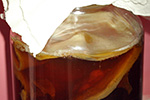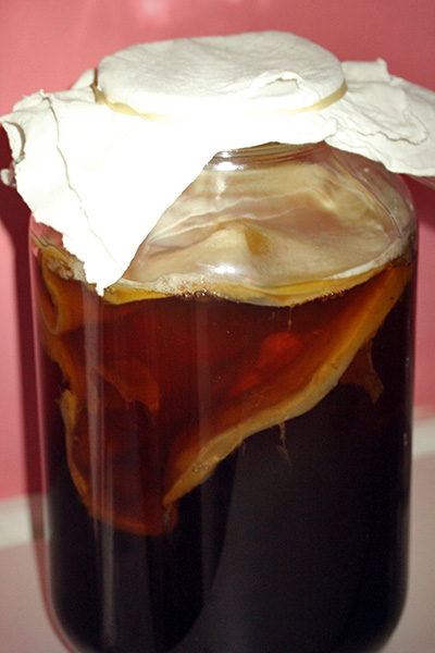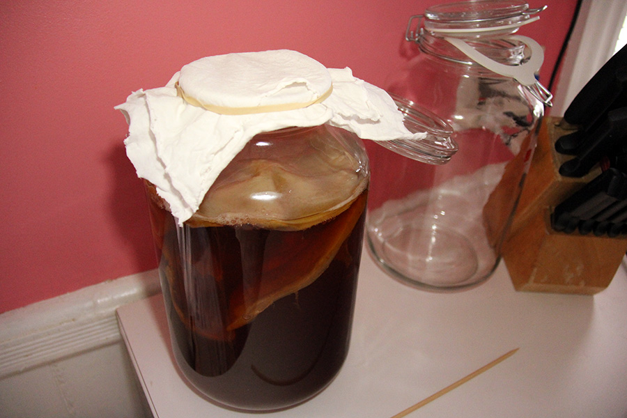i finished my 24 oz. jar of kombucha. not wanting the transparent proto-scoby that'd formed in the jar to go to waste, i decided to make a small batch of kombucha using another 24 oz. jar. i brewed some sweet tea in the jar with 2 black tea teabags and a few tablespoons of sugar. after the tea cooled down to 80°F, i slipped in the baby scoby (looked like a jellyfish) along with some kombucha juice. i left it on the countertop covered up with a paper towel and a rubberband.