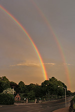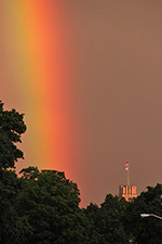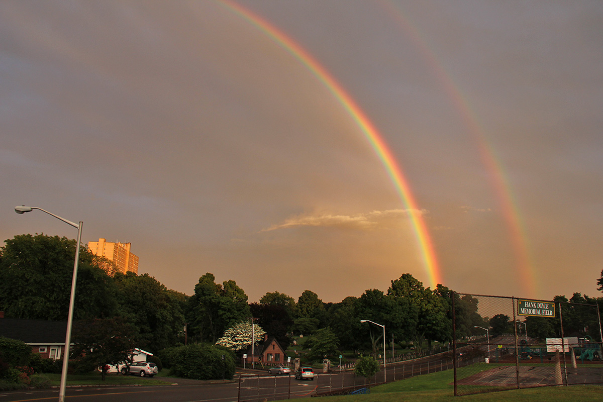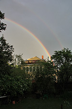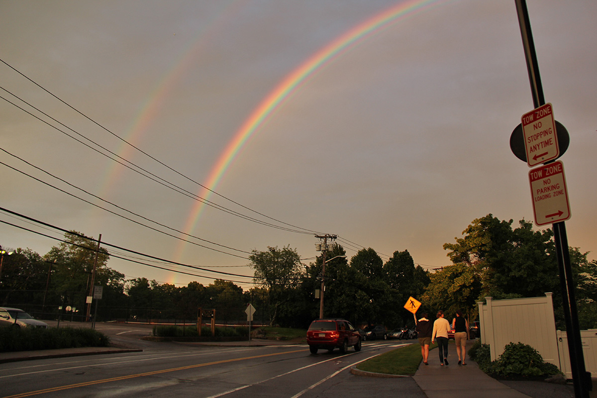 after dinner i was waiting for the weather to clear up so i could make a break back to cambridge. the transition into clear weather was abrupt, as i suddenly noticed there was sunshine. when i peeked out the window i saw the most magnificent rainbow. we don't often see rainbows here. because maybe there are so many buildings around to get a good view of the sky, maybe i'm usually indoors when it rains. but there it was, a half circle of colors. not only that, but it was a double rainbow too. we went out to the front of the house to get a better look, and up and down the street, people were also outside admiring the rainbow.