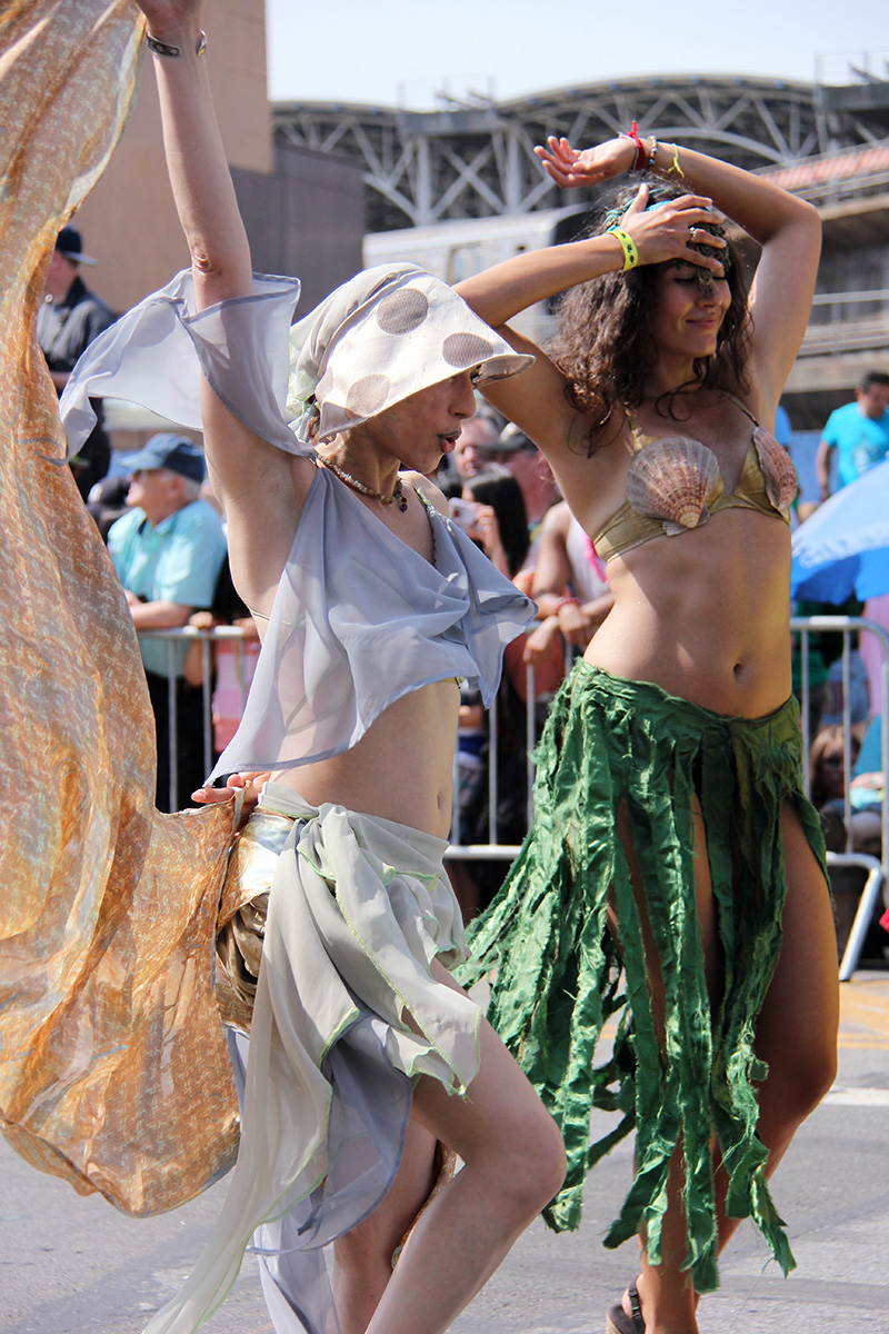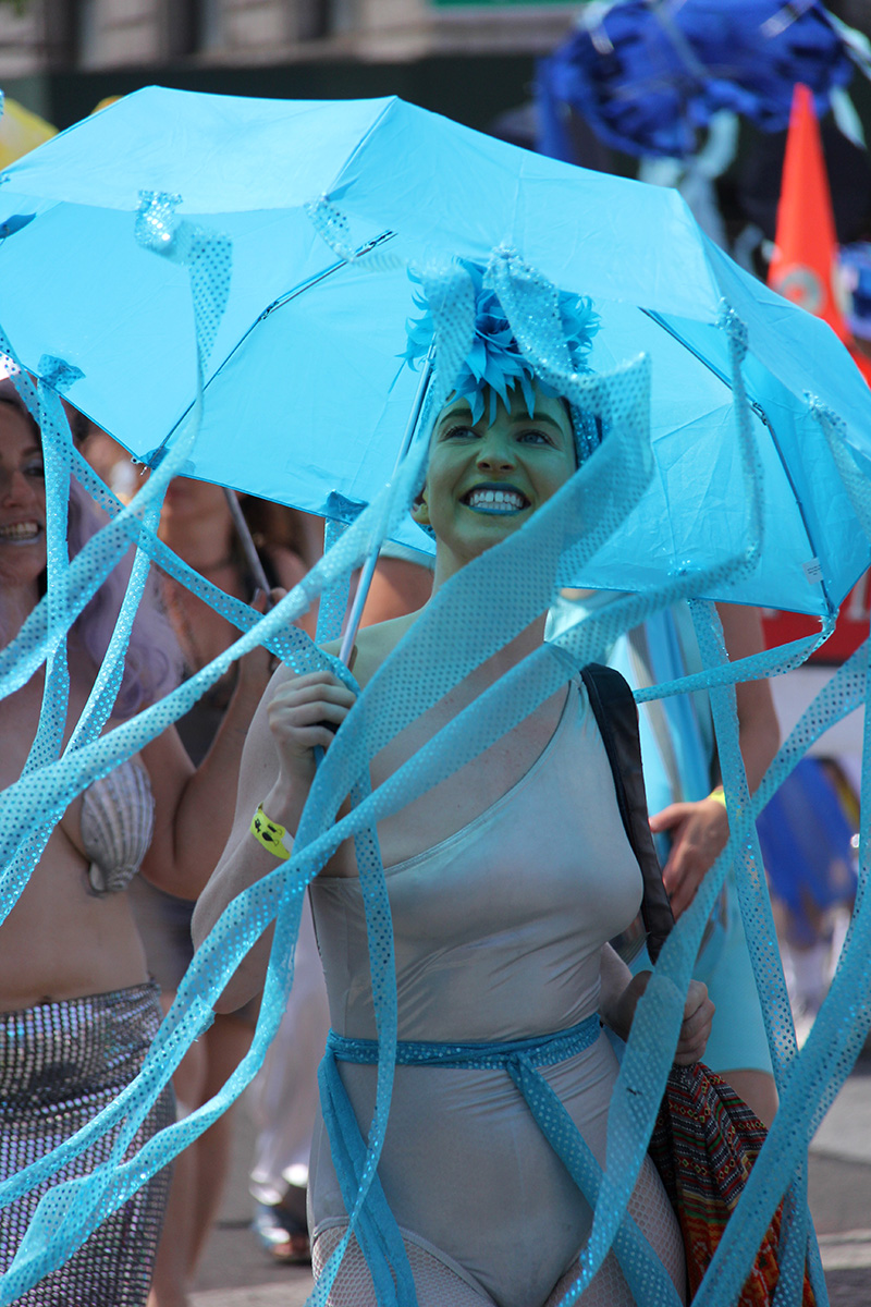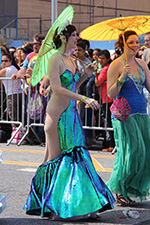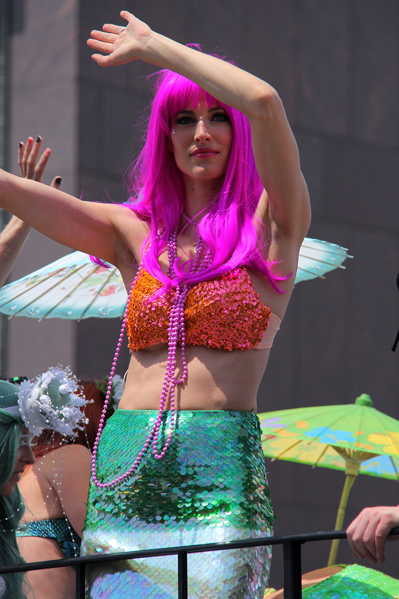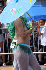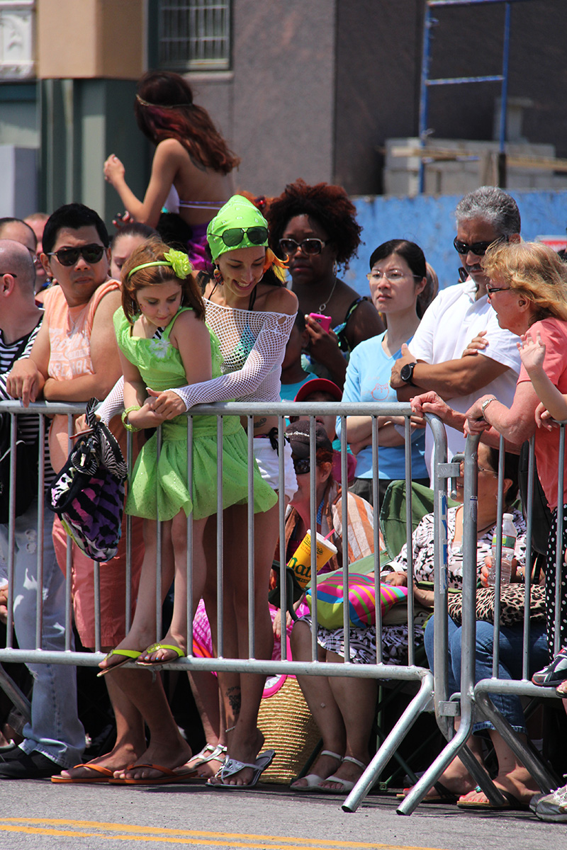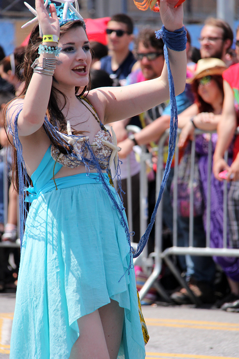 last year the barricades on the other side of the street was placed so far back that the parade marchers only interacted with the people on my side. this was great for photography. this year they finally got wise, and moved in the barricade, so now the mermaids interact on both sides, so there were a lot more photos of their backside. there also didn't seem to be as many photographers this year. last year they'd crowded the parade route so badly that sometimes i'd get photos of just photographers.