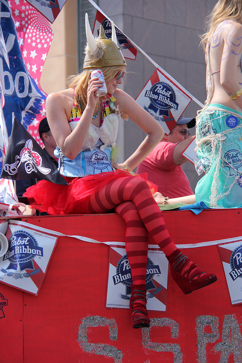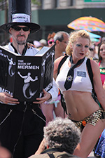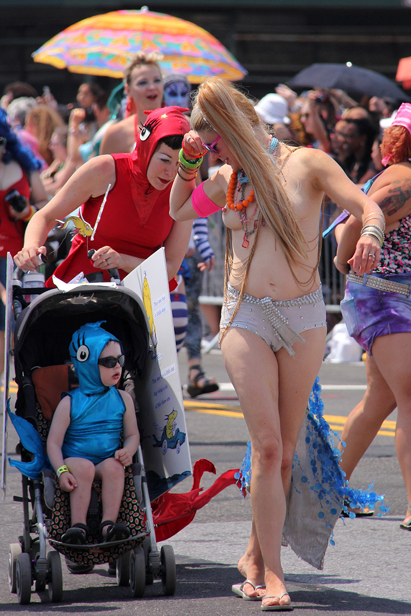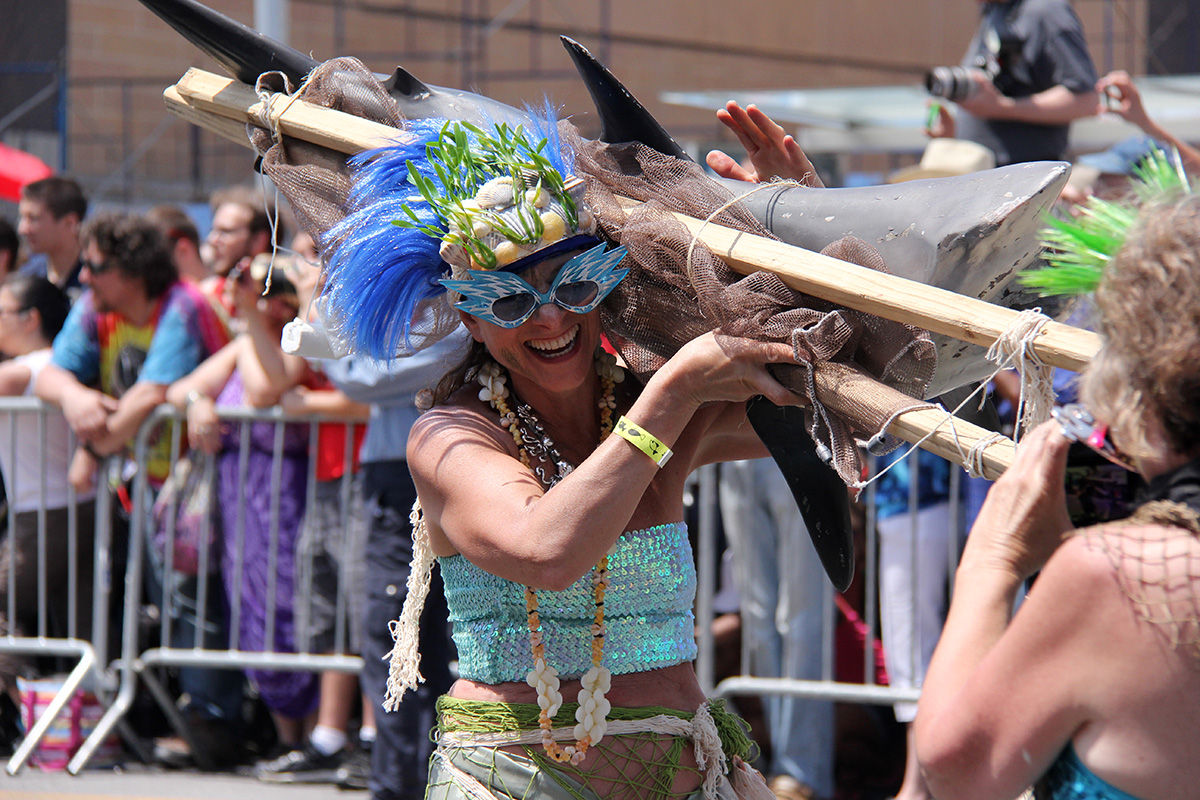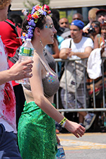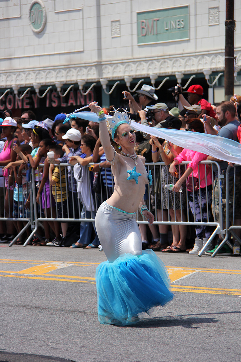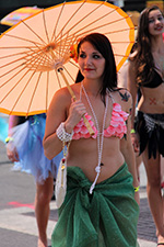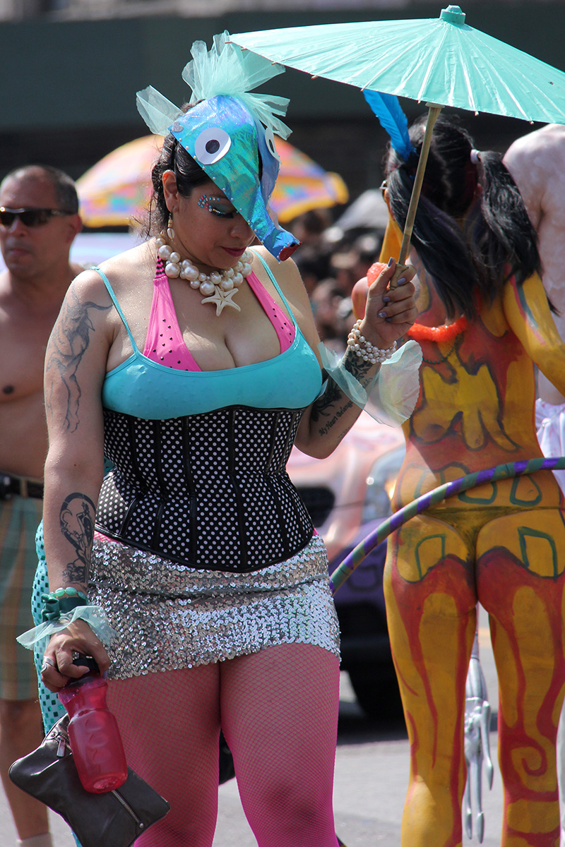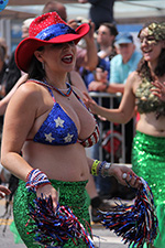 last year the barricades on the other side of the street was placed so far back that the parade marchers only interacted with the people on my side. this was great for photography. this year they finally got wise, and moved in the barricade, so now the mermaids interact on both sides, so there were a lot more photos of their backside. there also didn't seem to be as many photographers this year. last year they'd crowded the parade route so badly that sometimes i'd get photos of just photographers.