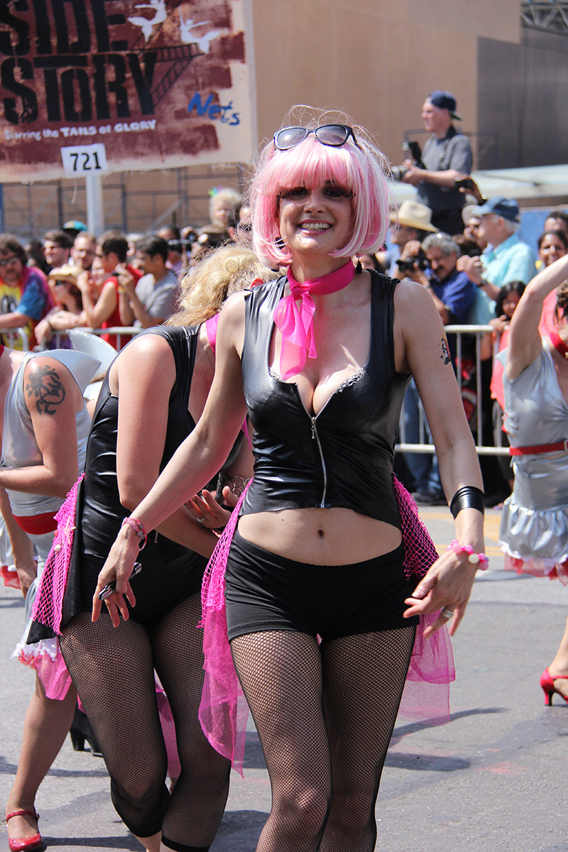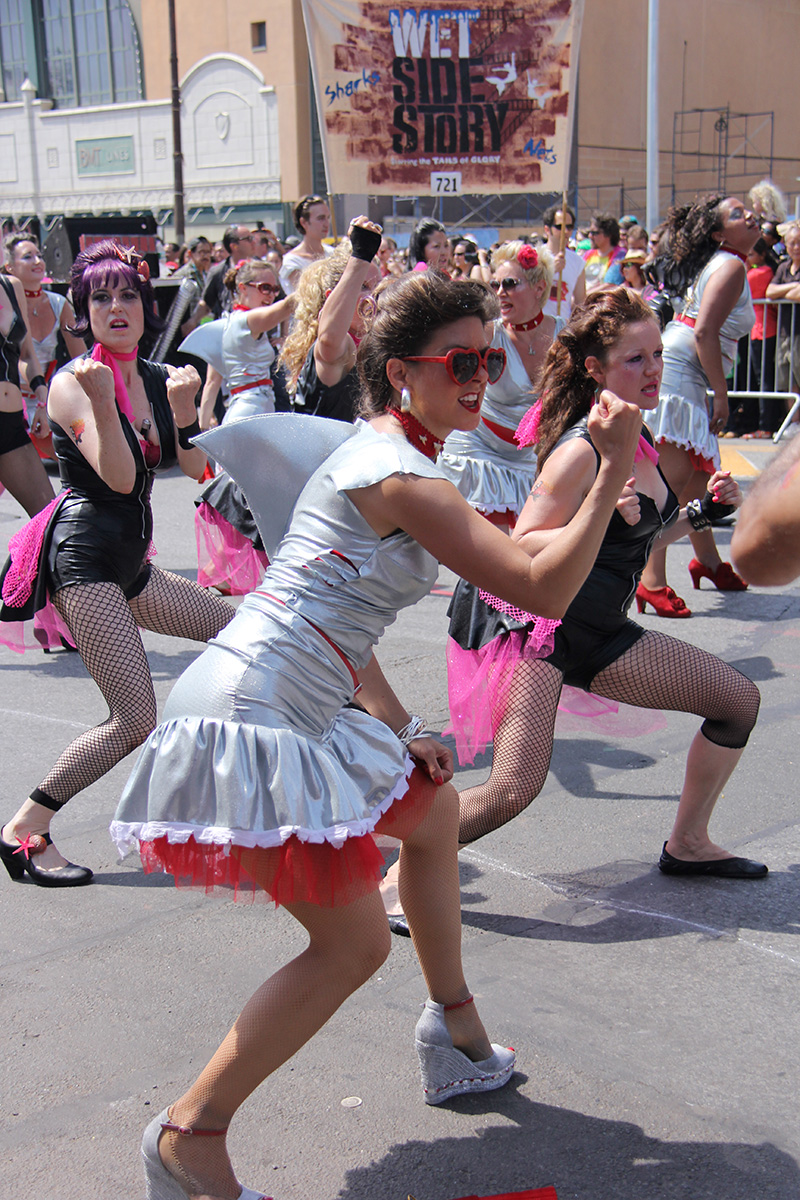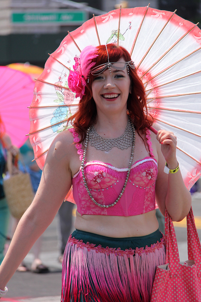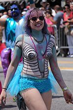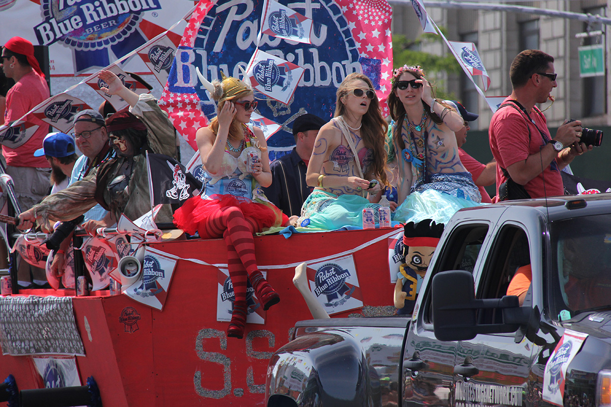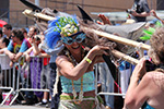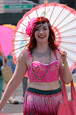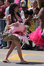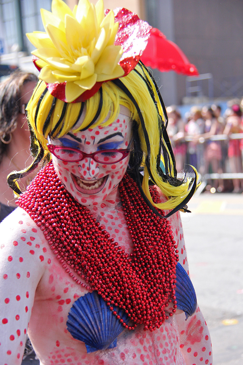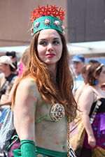 last year the barricades on the other side of the street was placed so far back that the parade marchers only interacted with the people on my side. this was great for photography. this year they finally got wise, and moved in the barricade, so now the mermaids interact on both sides, so there were a lot more photos of their backside. there also didn't seem to be as many photographers this year. last year they'd crowded the parade route so badly that sometimes i'd get photos of just photographers.