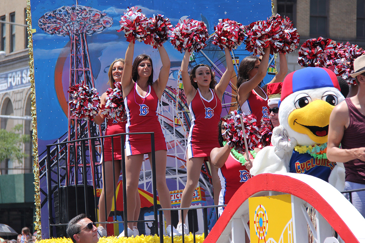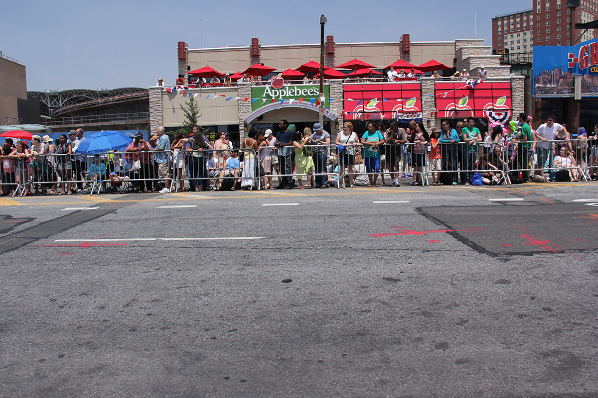 the train i was on had a few mermaids heading to the parade. some passengers were asking if they could get photos taken with them. we arrived in coney island shortly before 12:30. i didn't have time to walk around, all the best stops were already taken, but i did find a small space in front of a light post that i managed to squeeze into, but not before some townies we seemed to have been camping there hours ago shouted at me that the area was reserved, but let me have my spot since i was by myself. i was right behind the metal barricade so i could put my large bag on the ground, but it made me feel self-conscious with memories of the boston marathon bombing. to get ready, i slathered on some sunblock. if i was going to be standing there for hours on end in the sun, best to have some protection.