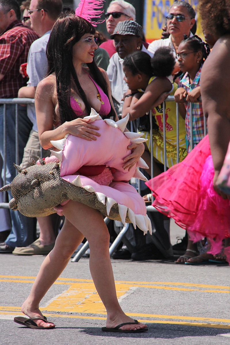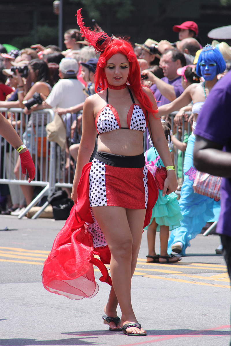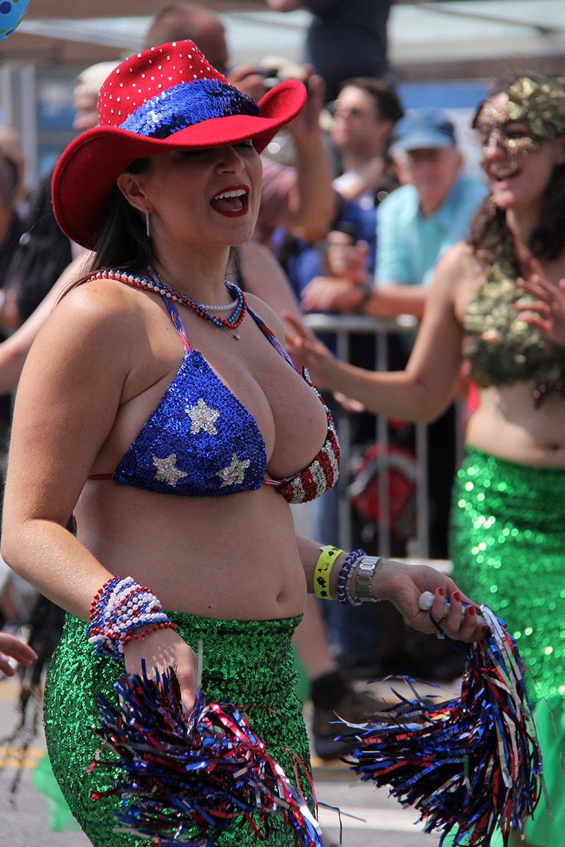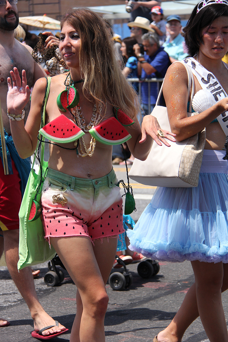 it was a bright sunny day, not too hot, with temperature in the 80's, and a nice sea breeze. i would've preferred a more overcast day since the sunlight causes harsh shadows (and especially since the parade route goes west to east, the sun is shining on the backs of the mermaids). but all the gear i was packing, it was for the best that it wasn't raining.