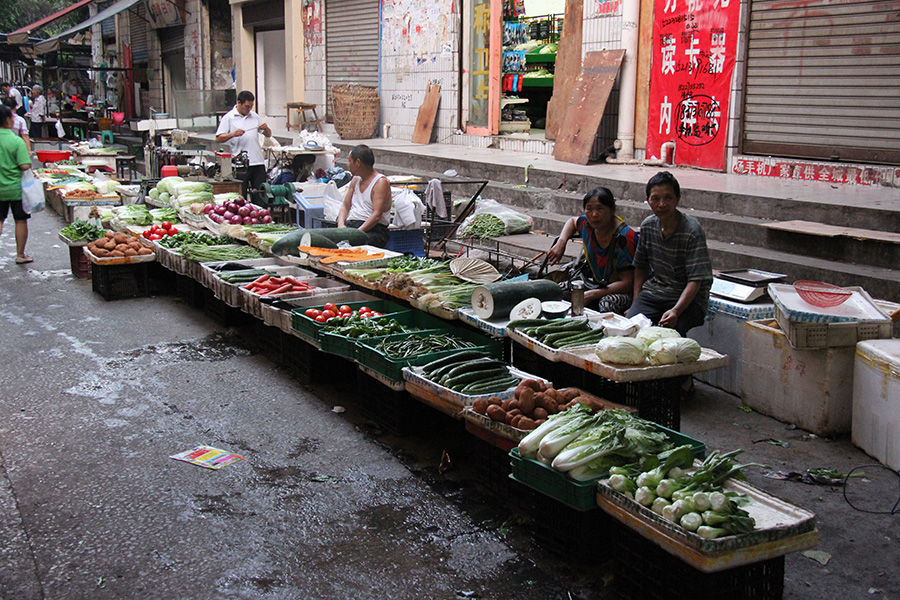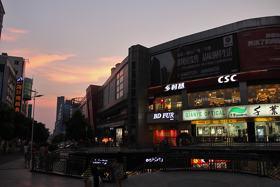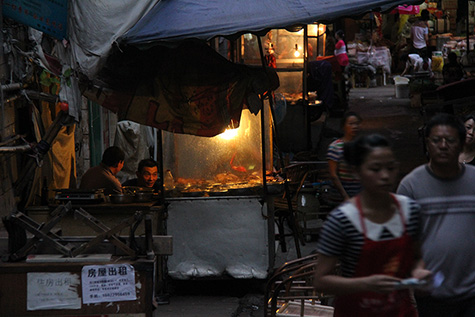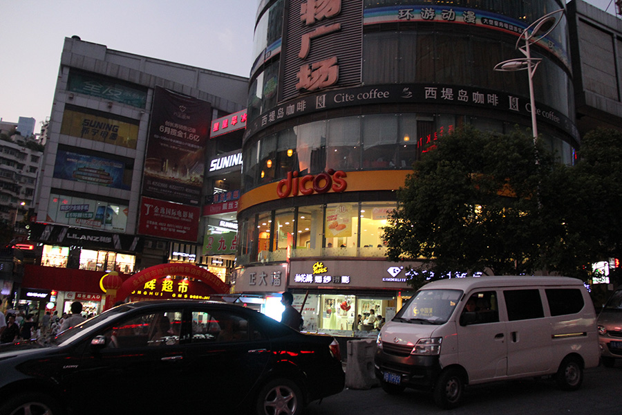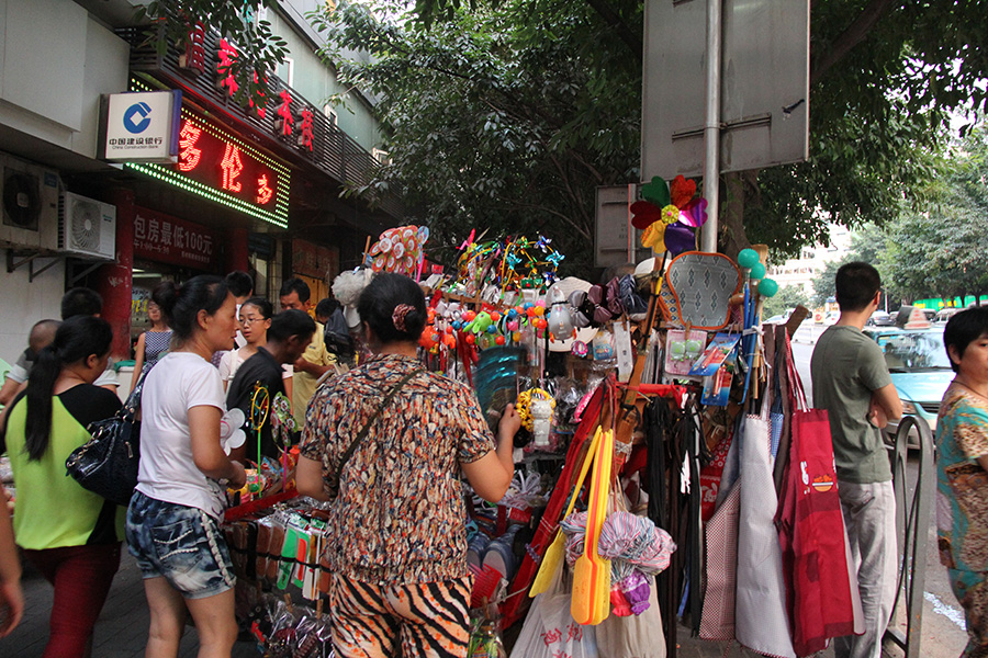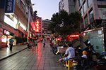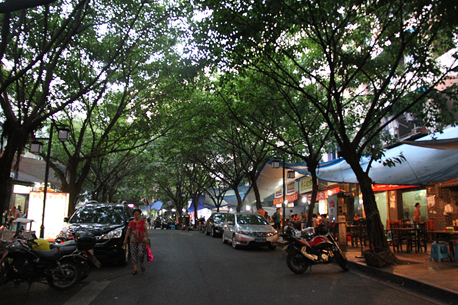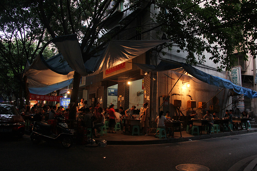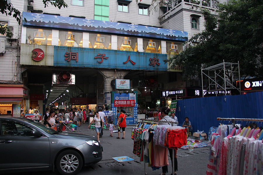 huey seemed like an expert but he'd only been to the old city 2-3 times before, coming here for the food. the local specialty seems to be a sort of hot dog with skewered meats. when we arrived, i quickly busted out my camera, because of the many photo opps: night produce markets, winding uphill roads under a canopy of trees, outdoor food stalls, night markets, department stores, grand plaza. the distance is probably about 2 miles. maybe too far to walk (especially in this chongqing heat) but just RMB$2 by bus. it's the sort of place i want to visit daily, and i wish i could live in the old city instead of the new city, since it has more character.