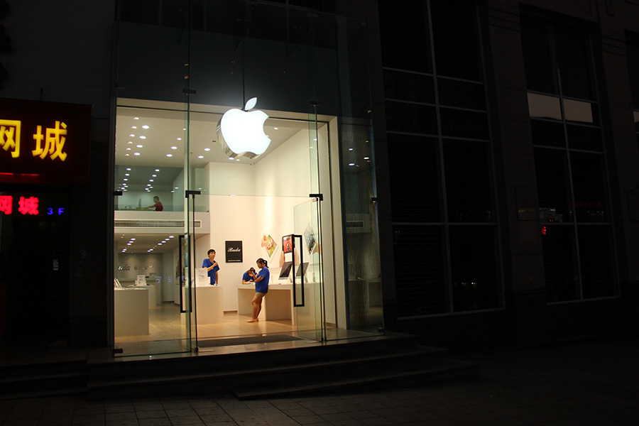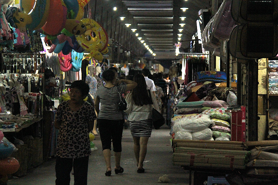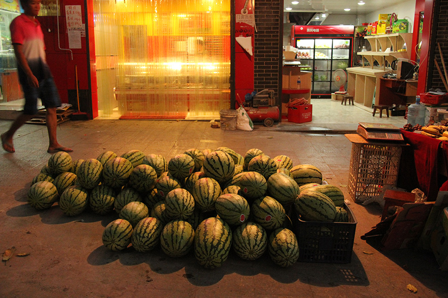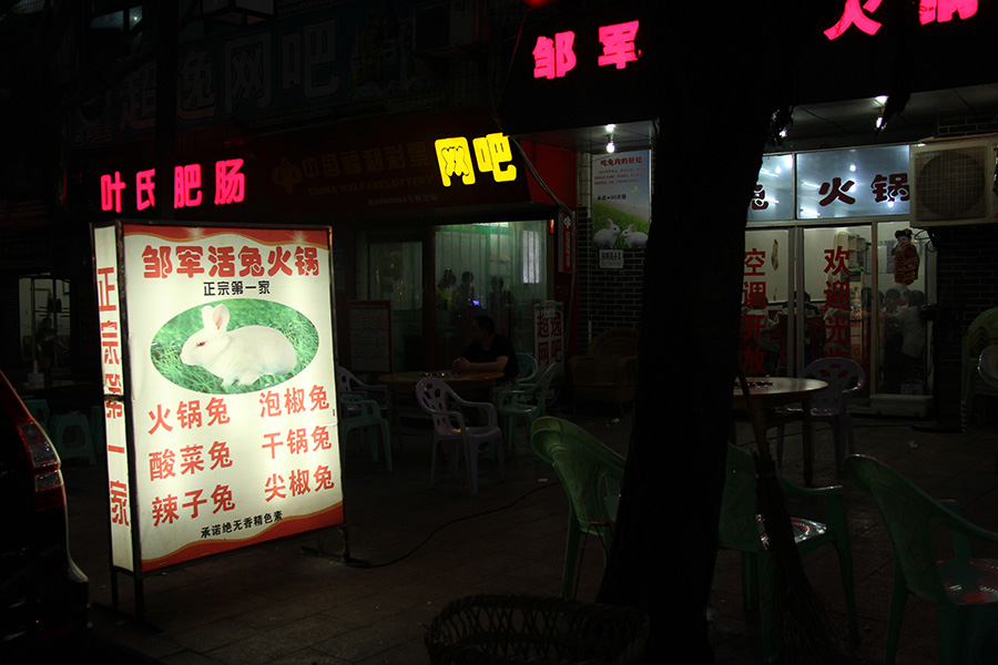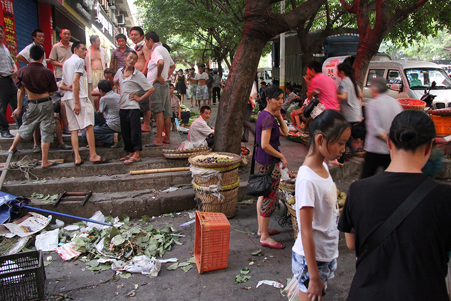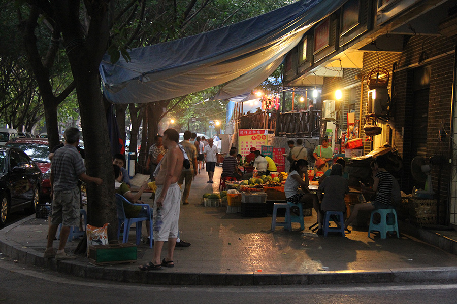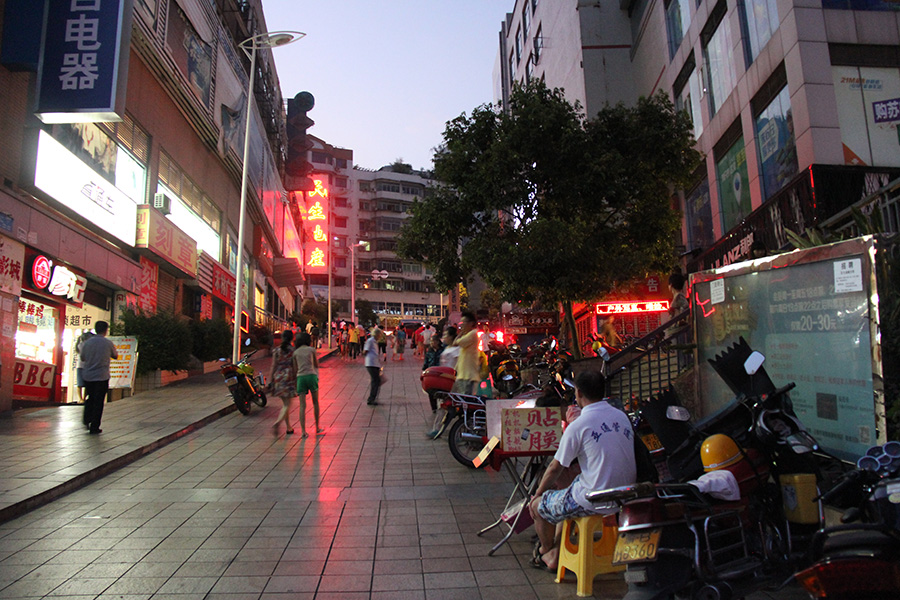 huey seemed like an expert but he'd only been to the old city 2-3 times before, coming here for the food. the local specialty seems to be a sort of hot dog with skewered meats. when we arrived, i quickly busted out my camera, because of the many photo opps: night produce markets, winding uphill roads under a canopy of trees, outdoor food stalls, night markets, department stores, grand plaza. the distance is probably about 2 miles. maybe too far to walk (especially in this chongqing heat) but just RMB$2 by bus. it's the sort of place i want to visit daily, and i wish i could live in the old city instead of the new city, since it has more character.