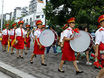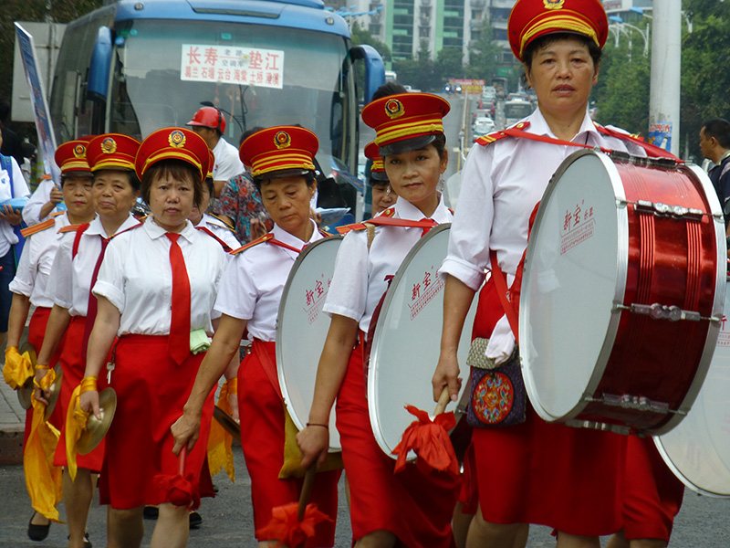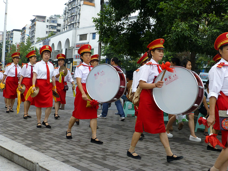 arriving at our destination, we crossed the street to get to the bus station, huey taking the opportunity to smoke a cigarette before we went inside. i noticed an animal had been run over on the road, couldn't tell from the remains what creature it is, hopefully it wasn't a stray dog or a cat. also a loud procession of old ladies wearing matching band uniforms paraded down the street banging drums and cymbals. i'd seen them before in the new city, figured they were for hire for special events, turns out they were just marching down the sidewalk with some paid advertisement.