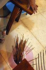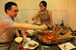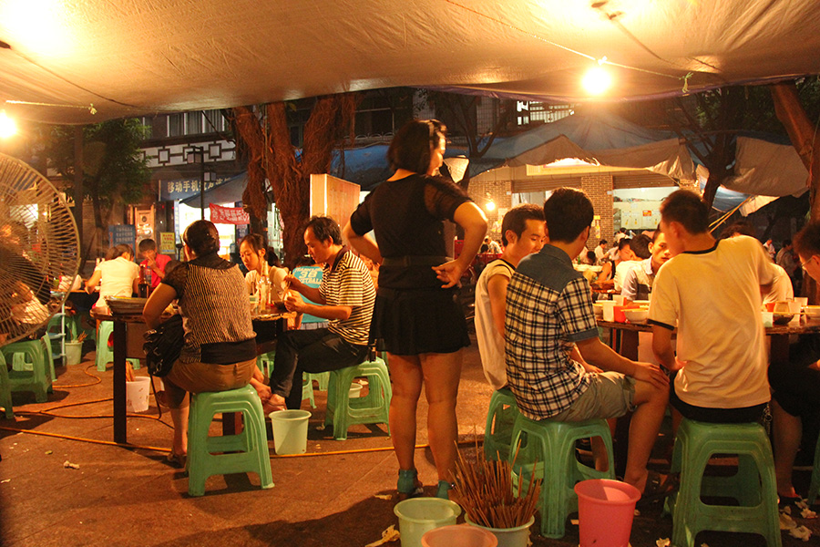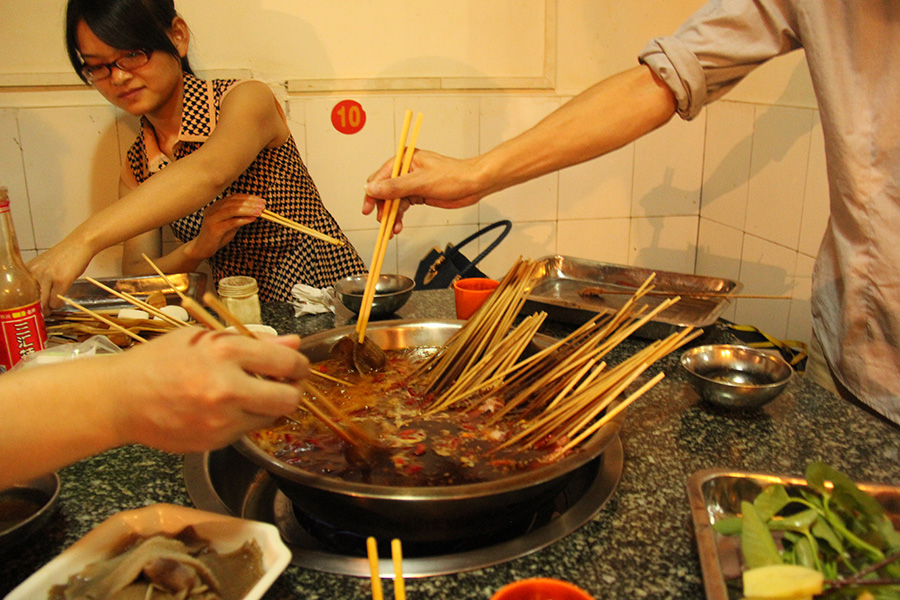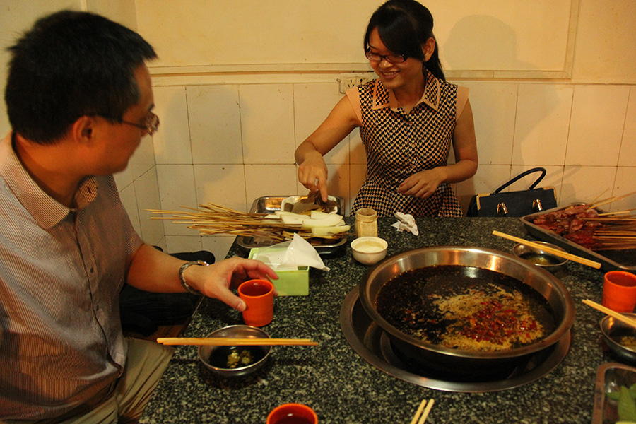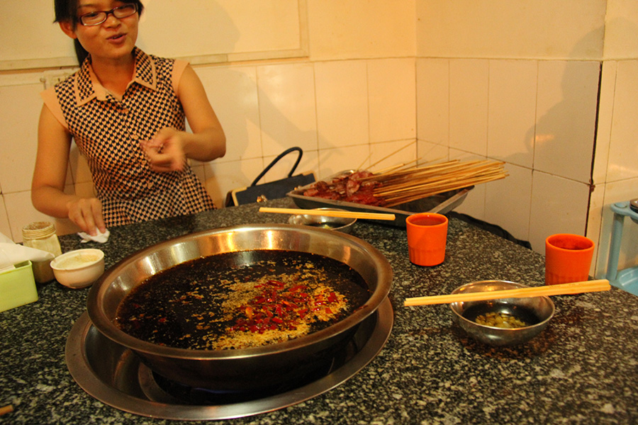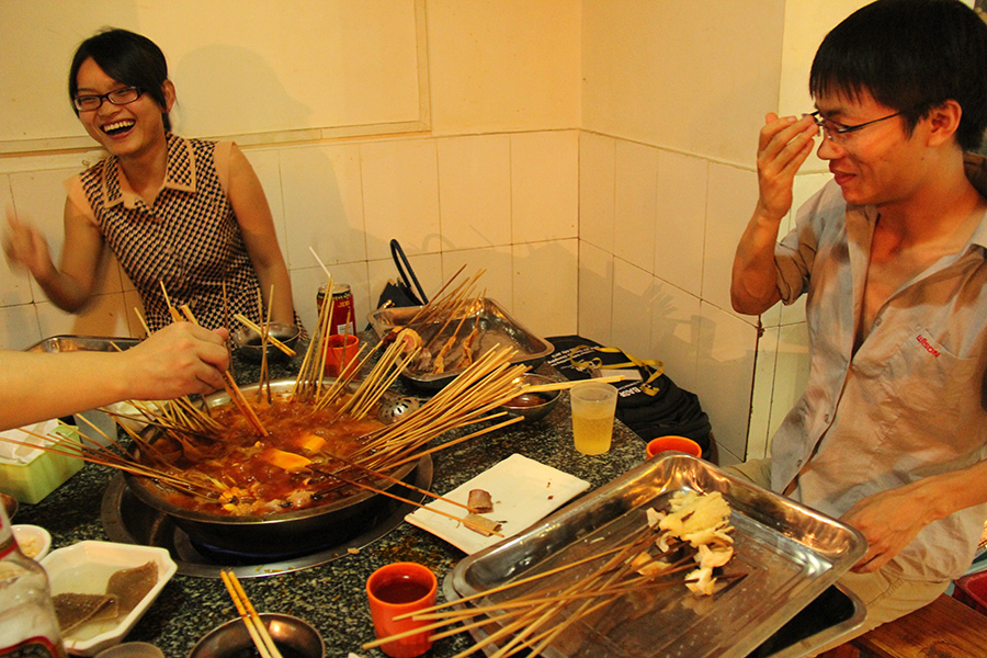 tonight i would try skewered "chuan chuan" hot pot, a special style of hot pot that involved food on sticks. we didn't really have a place in mind, and picked the one that seemed to be the most crowded. ideally we'd sit outside for hot pot (and for better photography), but today was unusually cool (75°F, normally it's around 90°+) and it looked like it'd rain, so we sat inside.