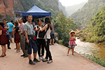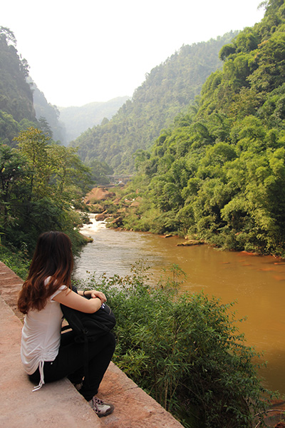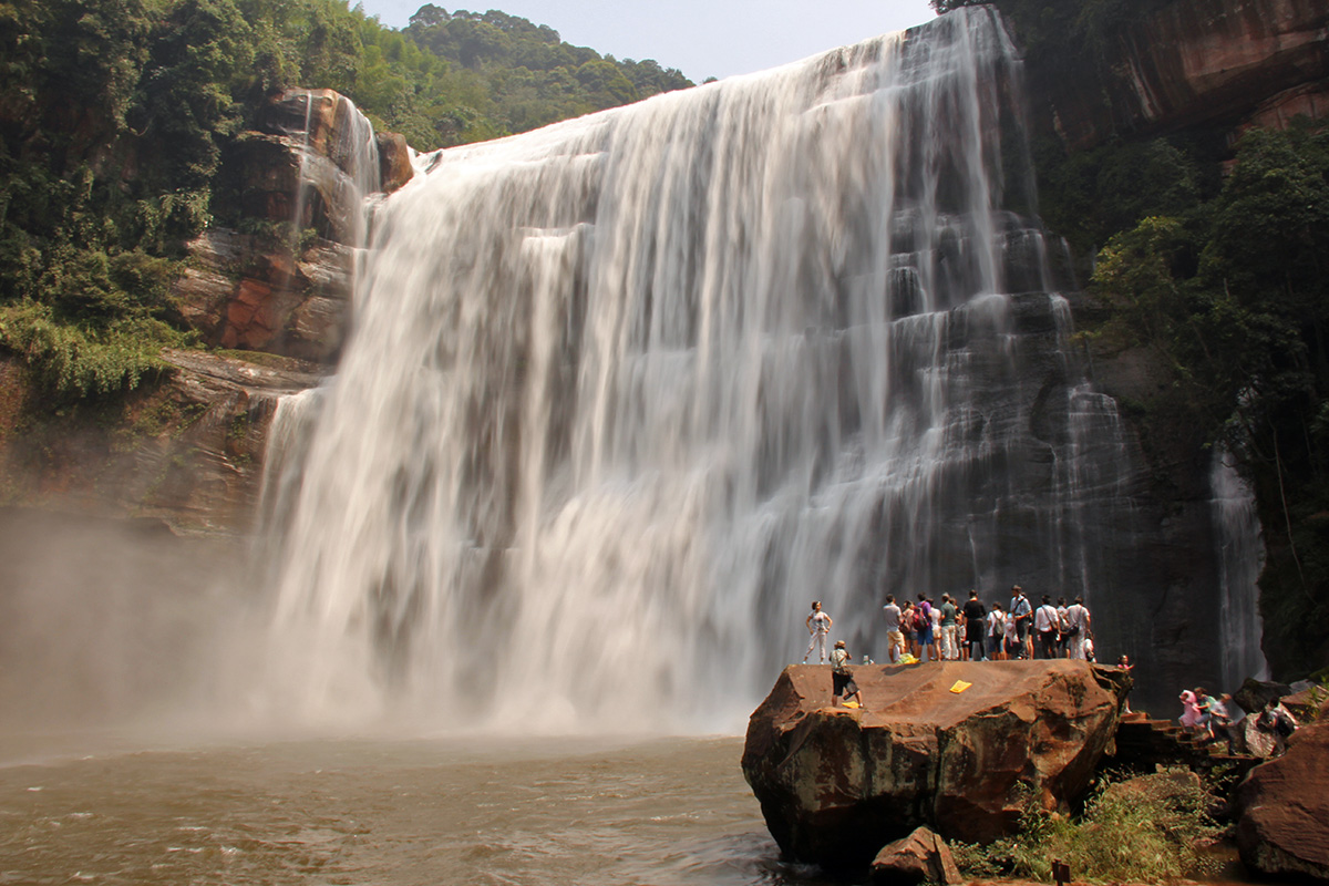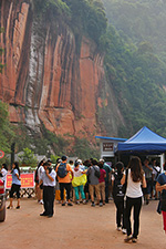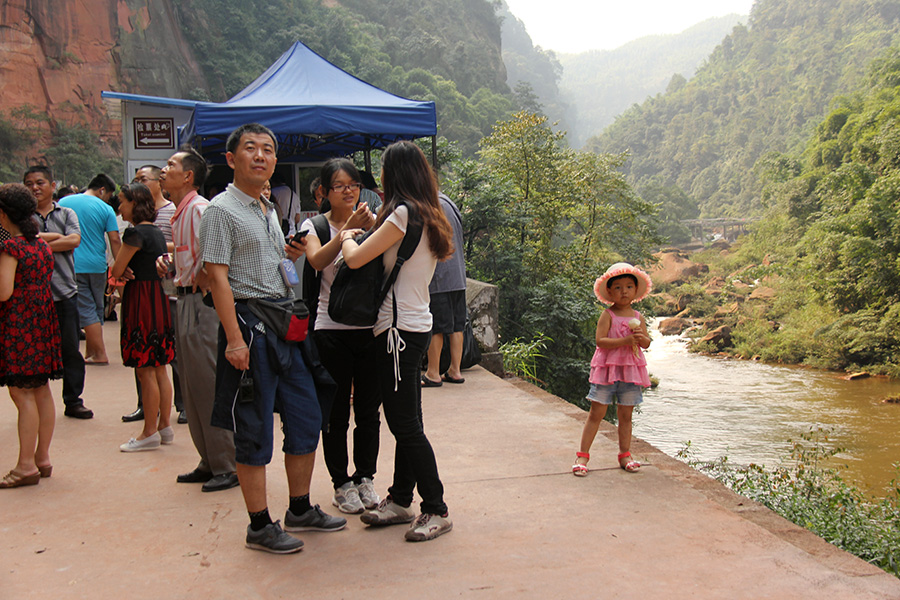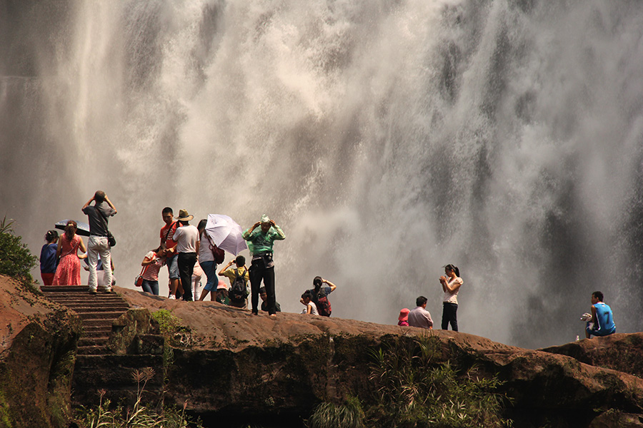 Large waterfall: rmb$40 for ticket. Driver gets us a discount with his id card, tries to use brother and sisters but nobody can pass for them. There is a large piece of danxia out by the entrance right above a public bathroom. Another rmb$20 for shuttle ride to take you to the top of the mountain. There nothing to see on the road, except a crescent shaped waterfall, and actually kind of dangerous because of car traffic. Most people walking up seem like college students too poor to pay the 20. Fy walks ahead of us for most of the time, since she isn't taking photos like us. This is the second largest waterfall in guizhou if not in all of China after huangguoshu. The speed of the waterfall is so fast it creates winds that blows visitors as they leave.