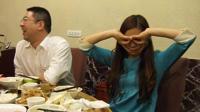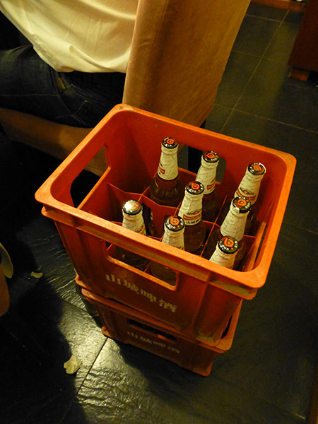 earlier i was explaining to fengya what it means to be "fashionably late." everyone had already ate but they were on their second wind. they were only drinking beer, so my bai jiou was a bit excessive, although greatly appreciated by guo, who would take the bottle home with him afterwards. they had 2 cases of free beer provided by the restaurant (3.3% alcohol content, almost like water). the new person there was yangyi's girlfriend, who i'd never seen before. she was very curious about all-things taiwan, and didn't believe them when they told her how old i really was.