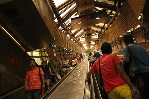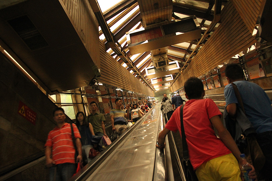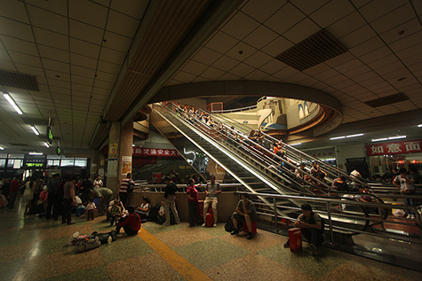 afterwards i went to caiyuanba bus station, to see if i could catch the crowd of travelers. i found the very long escalator and rode it down (RMB$2) to the bus/train stations. it wasn't as crazy as i thought. there were lot of people, but they were all waiting inside. outside was relatively calm, like any other day. i hung out at the station taking photos before going to guanyin bridge.