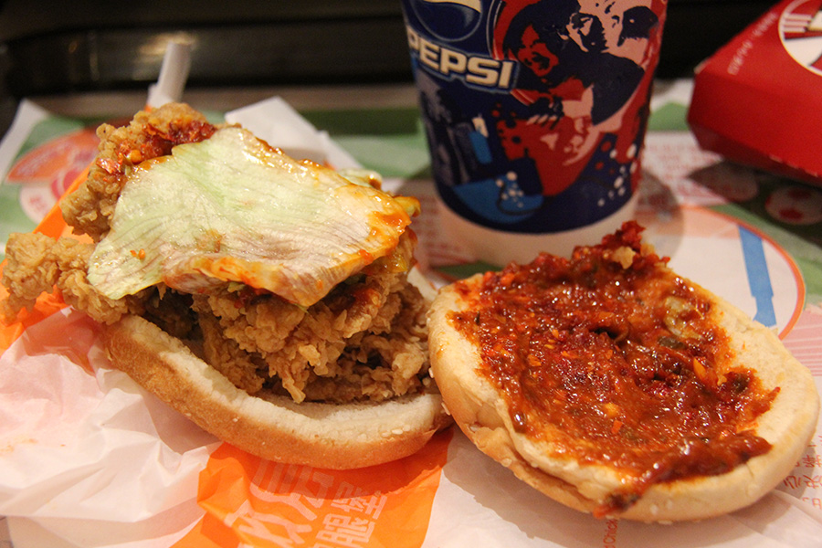 at guanyinchao i was looking for a heavier winter coat for my western sichuan trip. i went back to H&M, where they had ones for RMB$499. they're okay, about US$80. i'm hoping to score something cheaper. i was there for a while, visiting stores after stores, including some chinese name-brands, which had pretty poor craftsmanship despite the high price (RMB$2000+). i left without buying anything, but stopped by a KFC for a late lunch. i got the chicken sandwich but didn't realize it was "chuan flavor" as in "sichuan" which meant a dressing of hot sauce. it was okay, but i was hoping to avoid the spiciness. next time i'll ask for the original recipe.