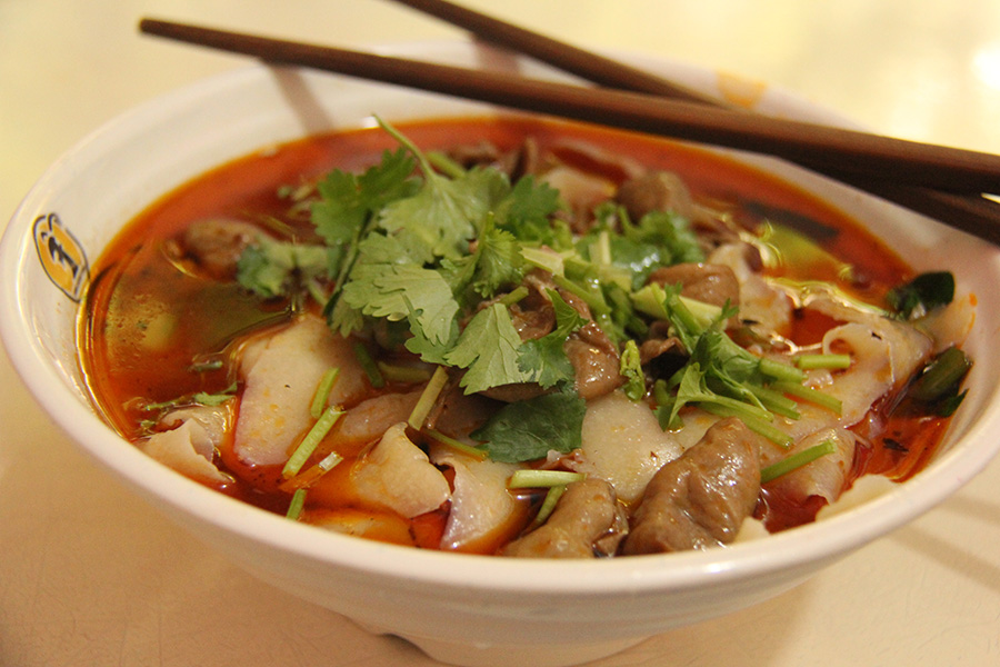 i couldn't find on the first or the second food street, but when i doubled back, i saw a place that looked familiar, except the restaurant name was different. confused, hungry, i grabbed a seat and ordered the intestines dao-xiao noodle soup (RMB$10). the noodle was okay, the broth on the oily side. looking at the menu posted on the wall, i noticed it was taped over another menu. when i went to go pay i asked if this used to be a different restaurant. they confirmed my suspicions, and the owner gave me a coupon for a free bowl of noodles on my next visit. i was really hoping to find some lamb noodle soup though. with the old place gone, i don't know where to go.
