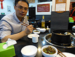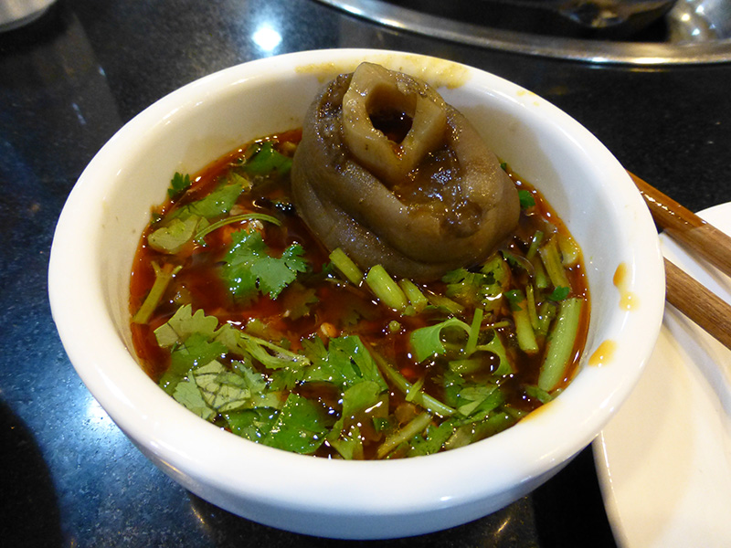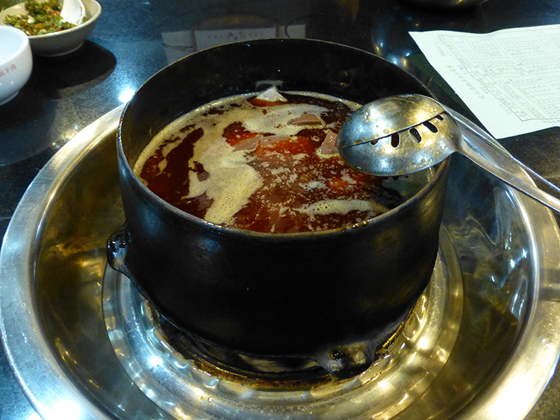 we were afraid the restaurant was gone after walking for a bit and not seeing it where it should be. but it was basically the last restaurant on that street, with nothing beyond that point but apartments. once again, the place was empty. people just don't eat lamb when it's hot. as for the place being empty, that wasn't entirely true, one of the private rooms did contain some raucous customers. the place served lamb hot pot. i was hoping it was clear broth but it was spicy (although not typical sichuan spicy numb style). we got a small pot, which was enough for the both of us.