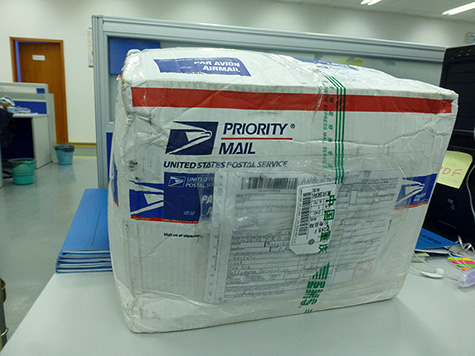 the care package my parents sent me last monday finally arrived today, a week later, via US priority mail. the delivery guy called me at the office to come outside and pick it up. the box weighed more than 12lbs, the postage US$83. typically one wouldn't need to send something like this via priority mail, but because my parents were hoping i'd receive it before i left for western sichuan, they paid for the expedited service. a week is pretty fast. usually packages to/from china takes at least 10 days to arrive. i didn't open it at first, hiding the box underneath my desk.