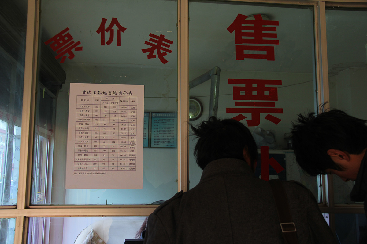 next was the bus station to ask about a ticket to kangding. the tiny station was empty, with an unused baggage scanning machine. i waited in line behind 2 tibetan men purchasing tickets, before a chinese man smoking a cigarette and a chinese woman barking in sichuanese forced their way ahead of me in line. the 3 of us talked in unison to the clerk, who was answering all 3 of our questions simultaneously. i can't purchase the ticket until the day before the trip. the trip itself takes about 10 hours, so the earliest we'd get to kangding would be 4:00.