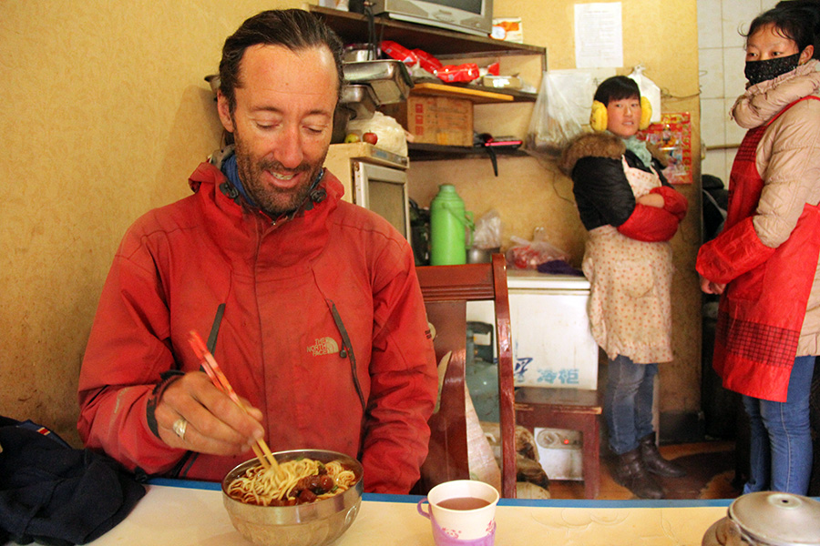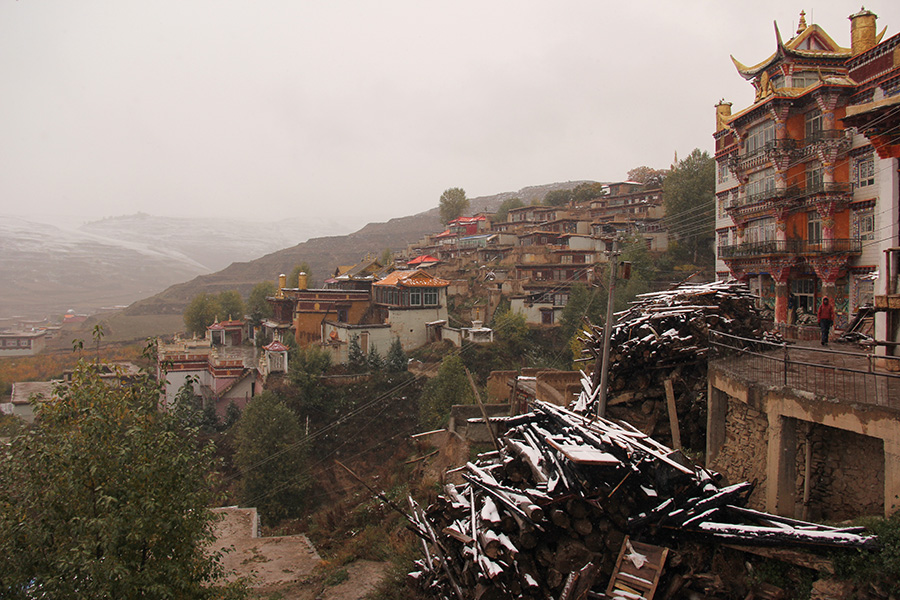 my roommate - a red army soldier i met on the minivan leaving from kangding - left this morning for a 7:00 minivan to continue his long trip back to his military base in shiqu, a distance of 310km northwest that will take him at least 10 hours if he can even make it because it started snowing here last night.