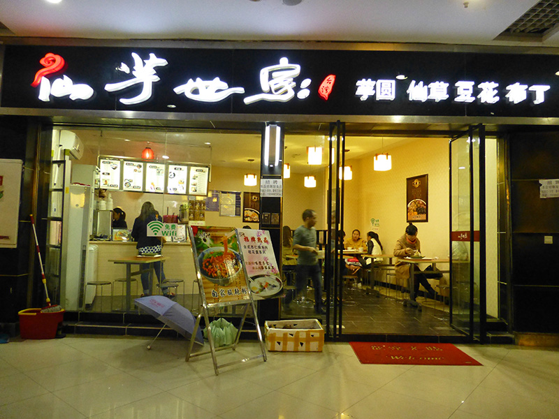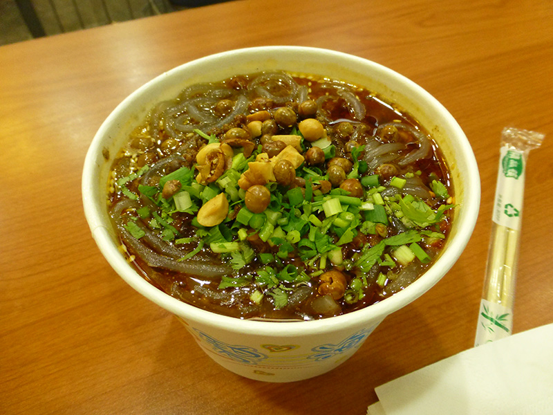 so continued walking in the direction of the central mall. there i found the taiwanese dessert restaurant. i figured i'd have some dessert first, then return to the new city to find some dinner, probably some dico's chinese fried chicken sandwich. although this place only had dessert, they did have one unusual entree which was a container of spicy sour cellophane noodles (RMB$8). i decided to eat that first, then have dessert later. the noodles were okay, spicy but not that sour.