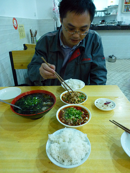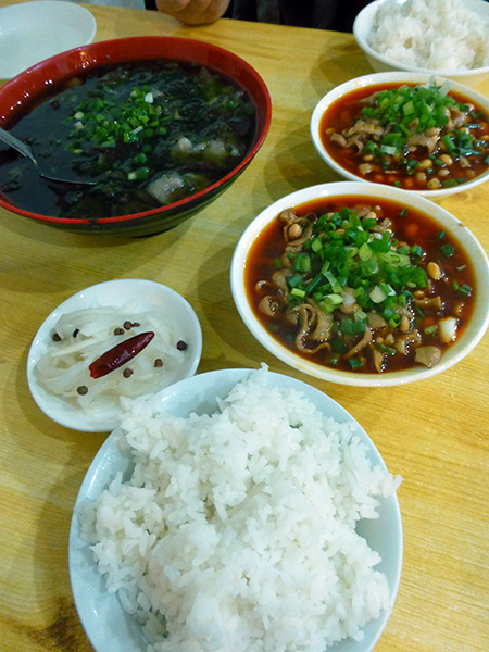 loren and i got off at my bus stop and found a place that served big (pork) intestines rice, which apparently is a changshou specialty,