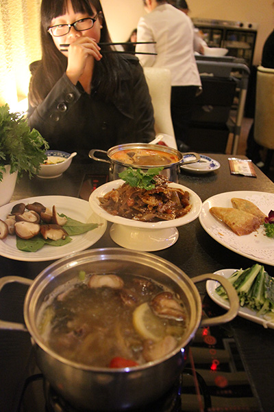 we went to the 4th floor of the chongbai mall for beijing duck. she thought it was my first time eating there (she'd eaten there many times before) until i told her it was actually my second time. fortunately there was no other coworkers dining there tonight, so there will be no office gossip about our date. we got one of the smaller 2 person tables along the side of the wall. i figured we'd just have beijing duck, but we ended up ordering a lot more: scallion pancakes, duck soup, fuxifeipian, 2 different types of greens (for the soup) and some mushrooms (additional soup ingredients).