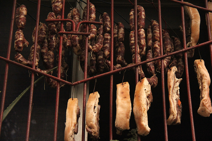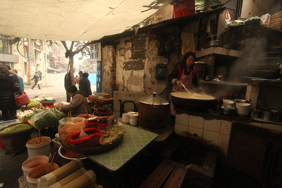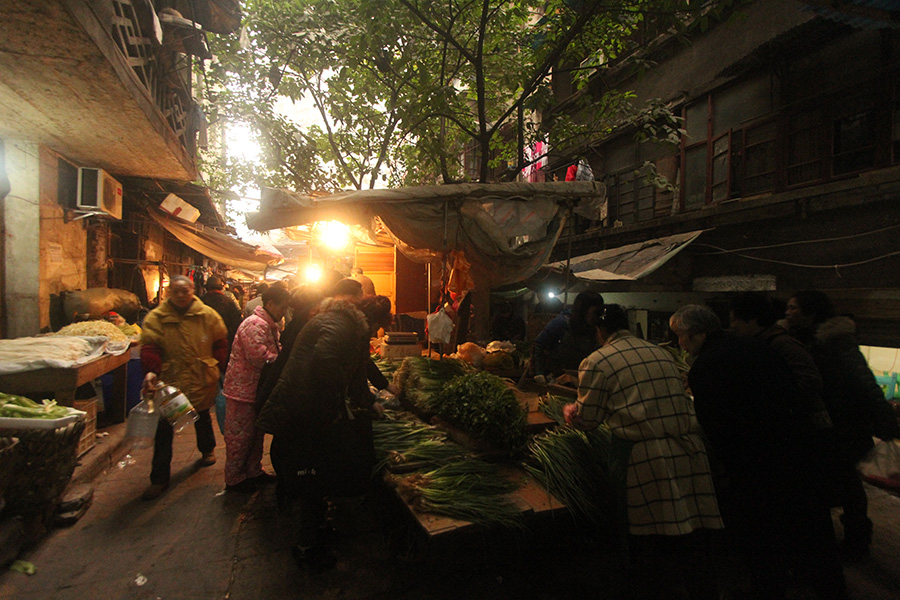 woke up at 9:00 * left the hotel by 10:00 * booked an additional day, maybe leaving for chengdu on friday * tu jia sandwich for breakfast (RMB$3) * accidentally stumbled across an open market - helped by foggy day + light bulbs in every stall + wide angle lens - once more i apologize to my poor shoes