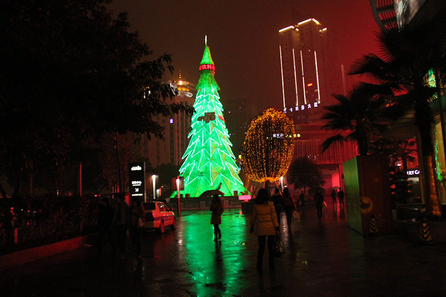 i returned to the hotel by around 5:00. i apologized to my shoes, took a shower, then relaxed until 7:30, where i got dressed and went back outside to look for some light dinner. i went to that taiwanese food truck again, this time getting the "sausage wrapped in sausage" (RMB$11). it wasn't that food. i wandered around the area a bit more, discovered a 7-up christmas tree, along with an H&M and uniqlo stores. returning to the hotel, i got some yanshuji from that taiwanese food truck.
