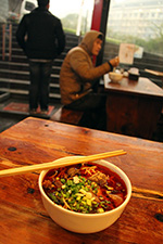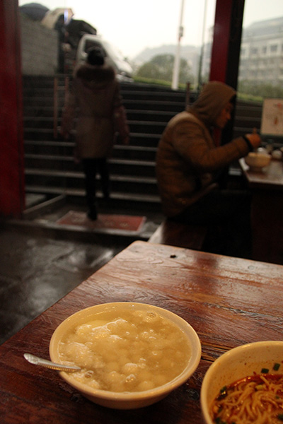 tomb decorations and afterlife offerings from the han dynasty; and finally a exhibit on southwestern chinese minorities. i stayed until well past 3:00. hungry, with my stomach growling, i headed to a nearby KFC i saw on my map. along the way, i visited a cloister of souvenir stores (almost bought some cheap jade trinkets, RMB$5 each) then stopped by a noodles shop. i had some intestines noodle (RMB$12) along with a bowl of fermented glutinous rice dessert with dough balls (RMB$6). the noodle was okay, should've gone with the knife cut noodles instead. the glutinous rice was very good, not sour, all sweetness, with some additional sugar.