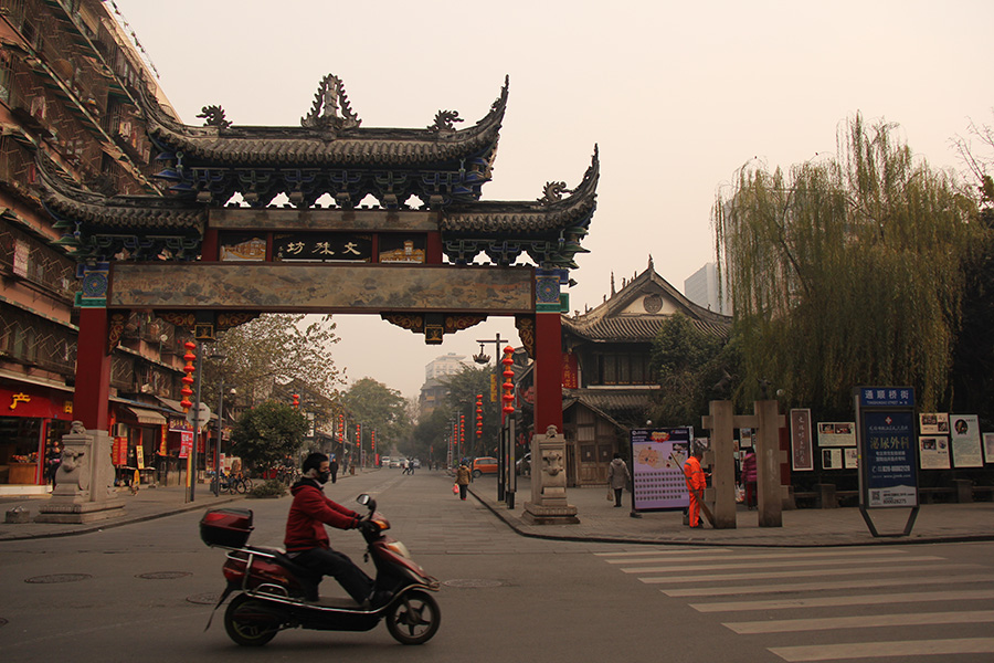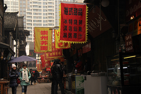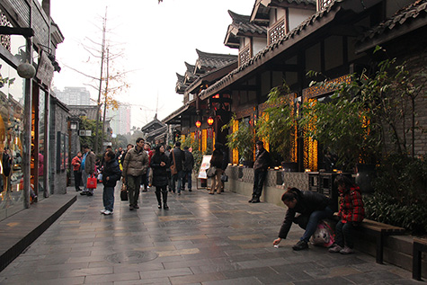 from there i walked to kuanzhai alleyway, passing through qintai road, another gentrified old street now turned into a high end tourist spot. kuanzhai alleyway was where the lady on the train told me i had to visit and was one of two places i was supposed to go with my tour guide. supposedly it's a street lined with chengdu specialty foods and bars. it's a nice place, but too high end for me, sort of reminds me of quincy market back home in boston.