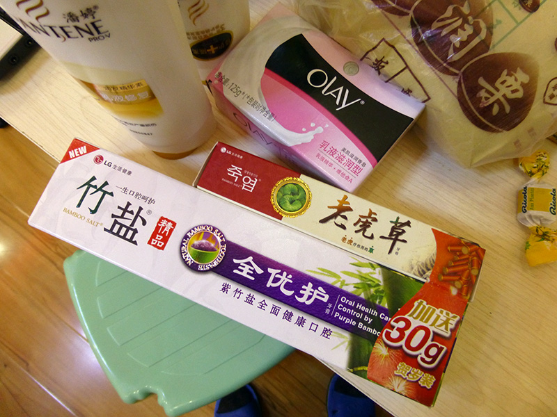 then i went to the chongbai supermarket to load up on a bunch of supplies, including salad vegetables (lettuce, onion, carrots), a peeler, a plate (5 months later and i finally buy my first plate), and some toiletries, including a new purple bamboo salt toothpaste and some pantene shampoo/conditioner. i called xianglian, who earlier was complaining of a stomach ache at the office because she went to go eat mao cai again last night. i called to see if she needed anything from the market. she seemed to be in a much better mood and said she felt better after having some dinner, and thanked me for my concern.