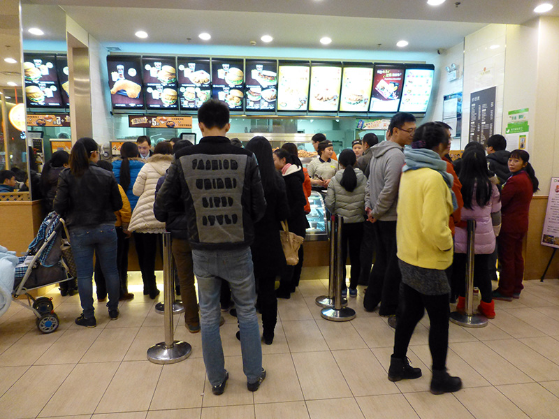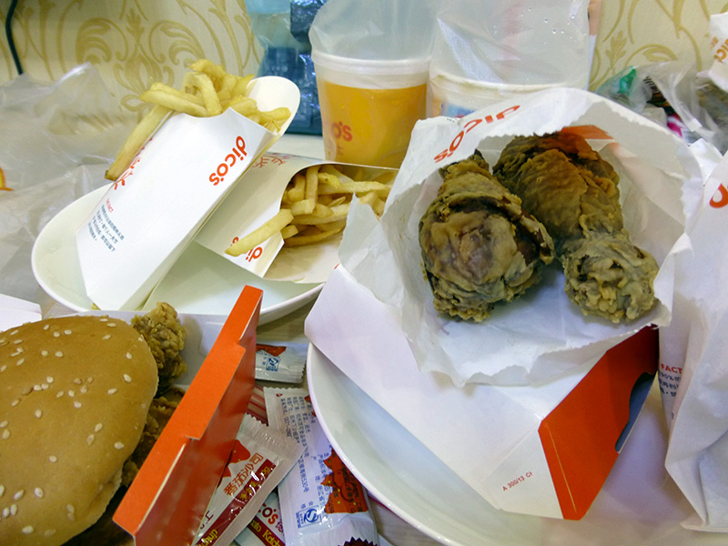dico's is chinese fried chicken, which is basically a knockoff of KFC. xianglian had warned me so i knew the place would be crowded on buy-one-get-one-free night (with membership card). it was mostly parents and children, followed by teenagers. it seems people were buying more than they could possibly eat. i did notice something strange about the chicken, which is they only have 3 kinds: drumsticks, nuggets, and wings. apparently the chinese have no appetite for breast or thigh. the wings are also small, nothing like the jumbo wings i'm used to back at home. i was tempted to get the bucket meal for RMB$89, which meant enough fried chicken and soft drink to last me for an entire week since i'd essentially get twice the amount. i settled for the sandwich combo instead, featuring a fried chicken sandwich, a drumstick, 2 wings, and a drink. i added some large fries (2x), with the total coming out to RMB$51. still kind of expensive, but i wasn't prepared for the amount of food until i got home.