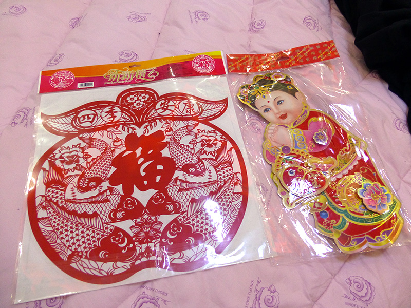 still, when i left work, i was in depressed mood, staring out the window in a daze. there was just a dozen people on the bus back into town. when we got back, i went to the small supermarket looking for some twine to string up my smoked meats. the only thing they had were plastic lines for RMB$6.5 a coil. i decided to look elsewhere, but not before i found a window thermometer that had both celsius and fahrenheit scales (RMB$17.5). bonus! i ended up going to the chongbai supermarket, where i realized i didn't need twine after all, since i had a hook in my house and i could just string up the meats that way. before i left though, i bought some chinese new year decorations. not for my own apartment, but for my parents to take back home to the US for next year.