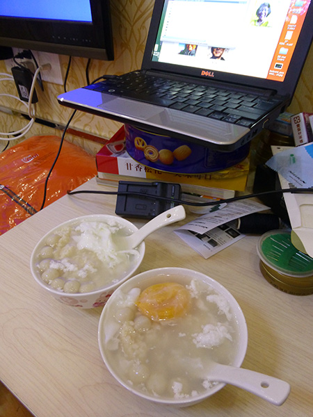 i always carry a hook with me in my backpack, since i never know when i have to go use the bathroom and need to hang my bag from the door. this hook came in handy tonight as i was able to hang up my meats in the kitchen. the only down side is now my apartment is beginning to smell like smoked pork. i made an egg-yak sandwich for dinner, and two bowls of fermented glutinous rice with tangyuan.