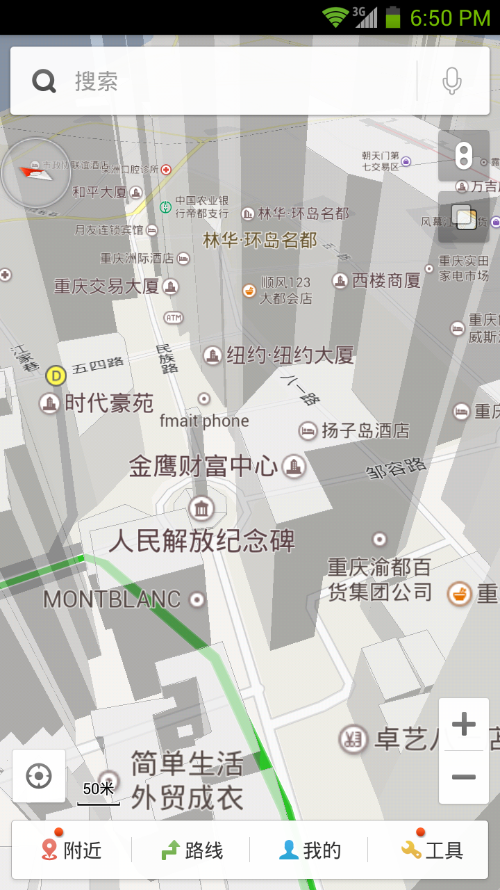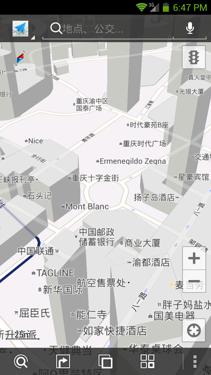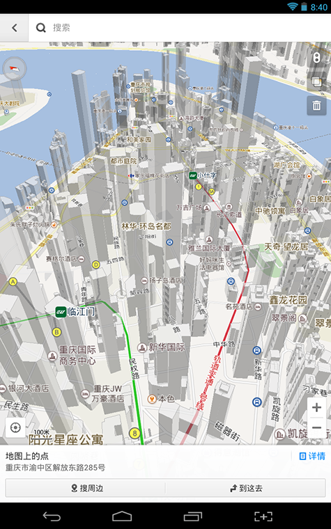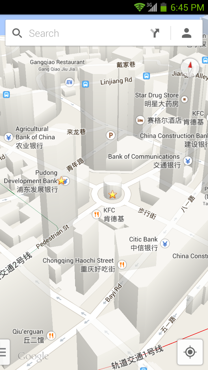 i installed baidu maps onto my phone a few days ago, after remembering being impressed with its interface on lihui's nexus. but it was an older version and every time it tried to self update, the app would freeze. but then today i discovered that baidu maps is actually available through google play, and not only that, it recognized i'd already installed a version, and asked if i wanted to update it, which it did so successfully. finally about to play around with the app, i noticed all the 3D buildings it had for chongqing city. later i'd discover that 3D buildings is also a feature in google maps and amps (the gps mapping program that came with the phone). baidu maps does the best job, but that's only because it's a google knockoff and since google services aren't officially supported here in china (and occasionally blocked as well).