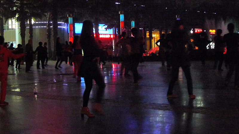 after dinner everyone went one way while XL and i went the other. mahui told me to walk XL home, which i was doing anyway, my excuse being i had to go to the supermarket to get a few things. it was still early - 8:15 - i asked XL if she wanted to shop for pants, but she was all set. seemingly ready to go home, she changed her mind at the last minute and decided to go with me to the supermarket to work off her food. we passed by block of dancing ladies at the plaza. xianglian handed me her purse and trenchcoat and jumped into the fray. her silhouette in the dark, prancing in her new shoes, was probably the prettiest one out there. she danced for 2 songs then we continued on our way to the supermarket.