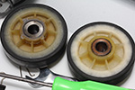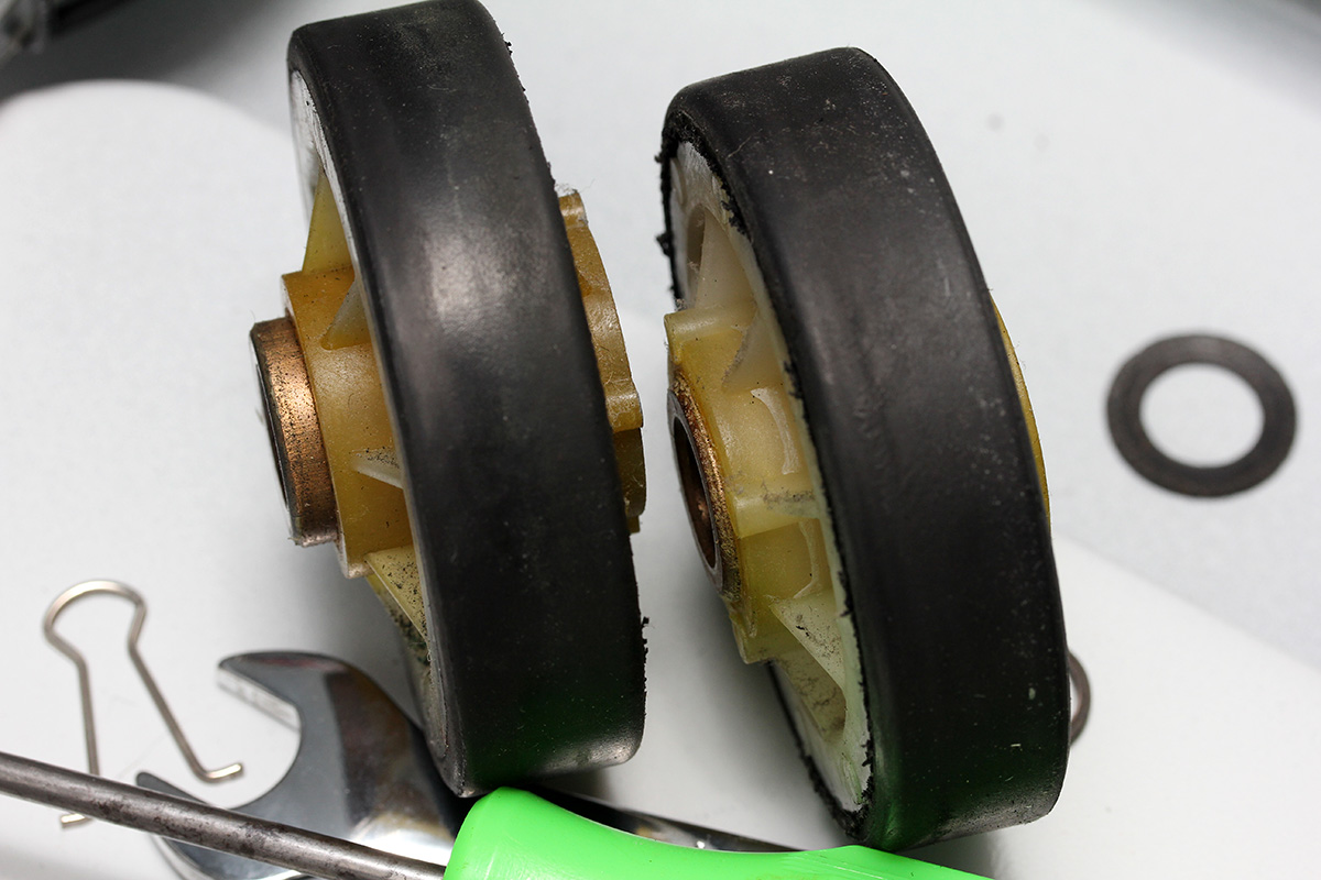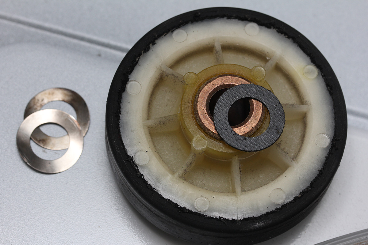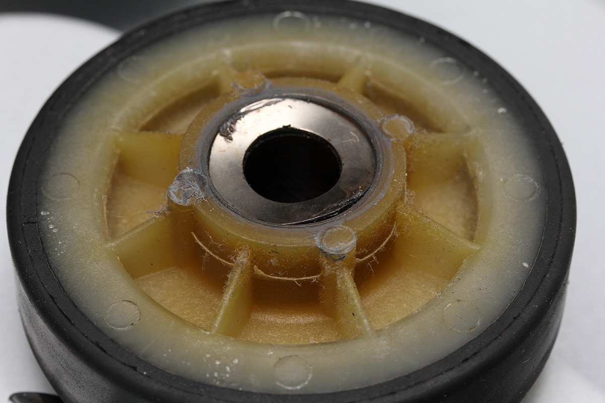 finally i got a chance to inspect the dryer drum support rollers. the left roller was still fine, but it was the right one that was stuck. it seemed that the core/bearing of the wheel had detached so the rim of the roller was rubbing up against the side of the washing machine. why it then got stuck who knows (maybe because the washers were jammed into the roller), but hopefully my replacement parts will arrive tomorrow and i can finally fix everything.