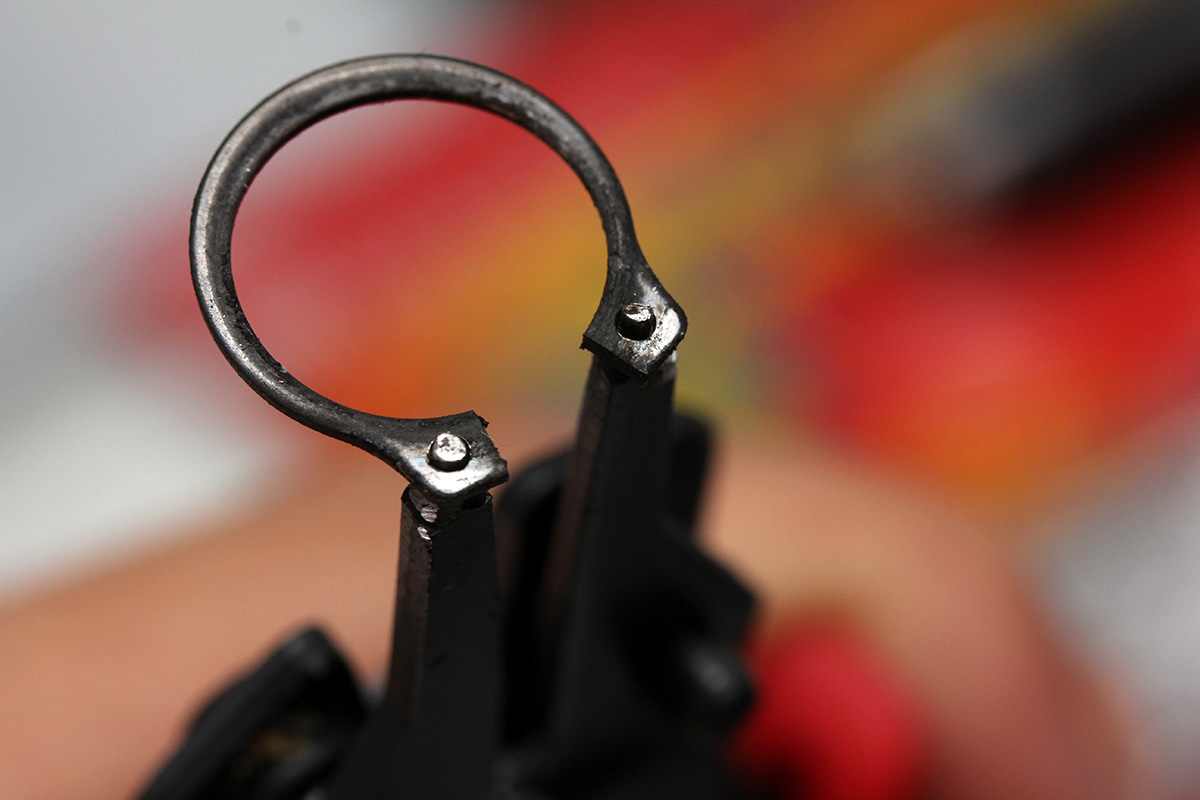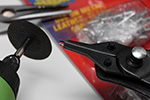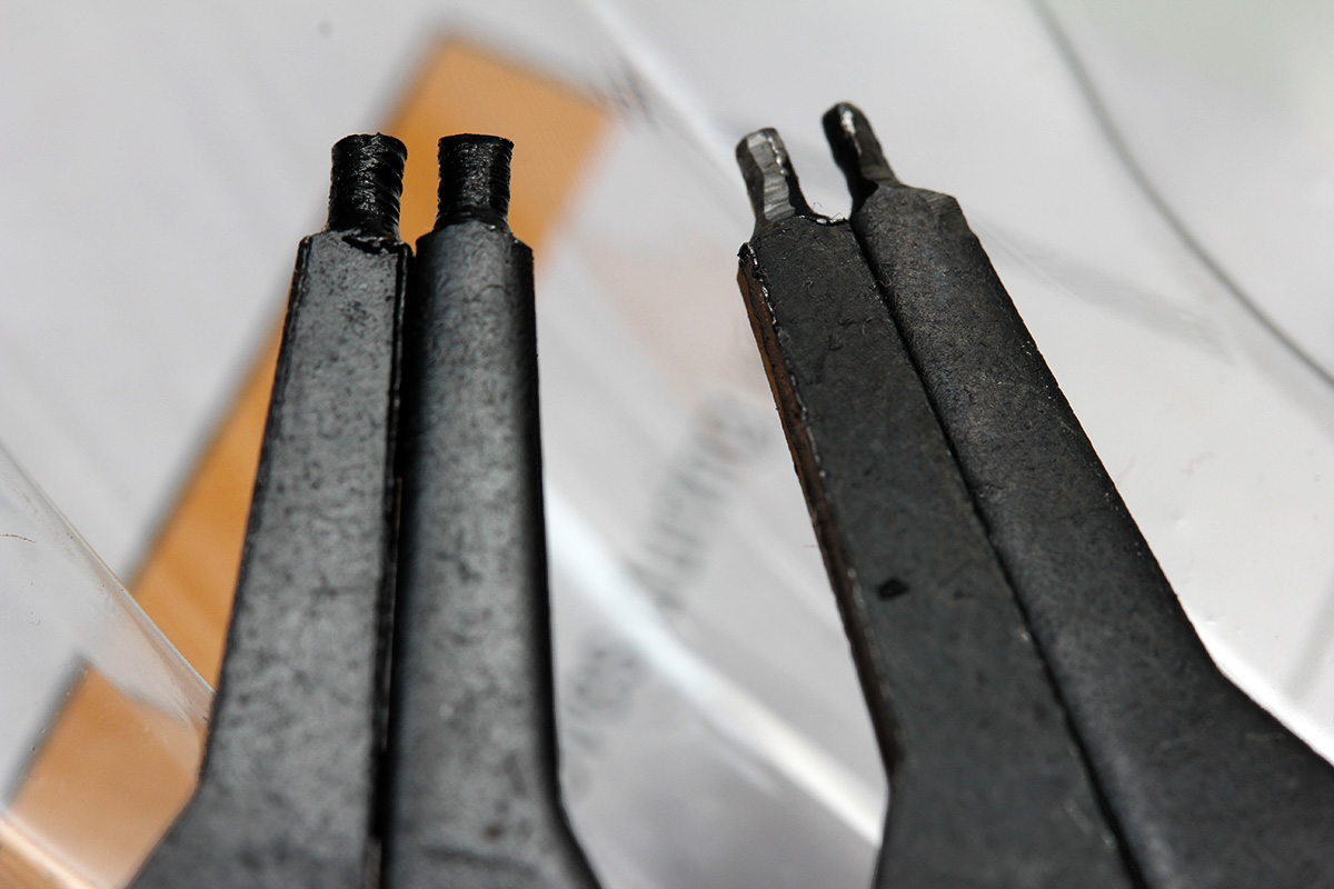 later in the evening i went to play around with the dryer and that's when inspiration struck: i could reduce the size of the plier pins with my dremel tool, slowly shaving it down so it was the right diameter. it took some time, with sparks flying into the kitchen trash can, as i slowly whittled the pins down to the correct size. once that was done, it was an easy matter of locking into the pins and removing them.