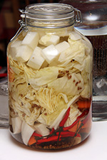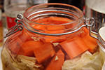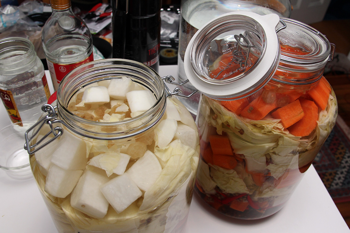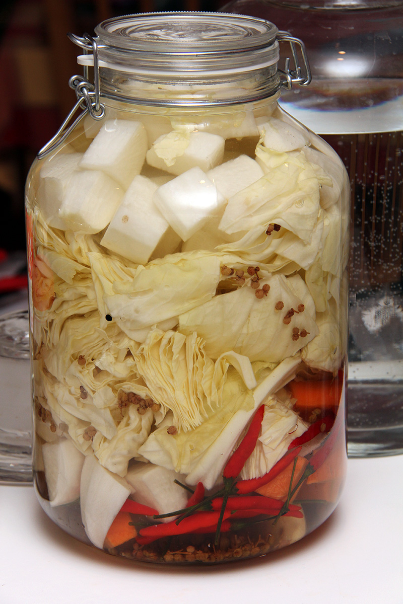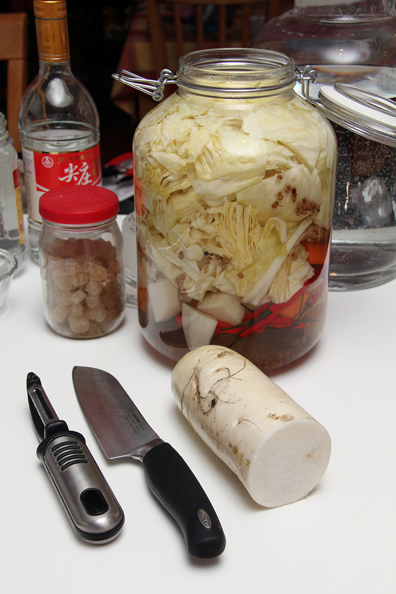 the daikon radish was for sichuan paocai jar 1, which still had some room. i chopped up the radish, added it to the jar, and let the excess brine overflow. i sampled a small piece of cabbage, very crisp and salty.