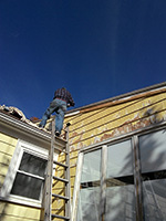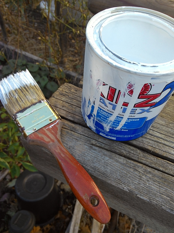 today i worked on priming all the bare wood window frames with a small can of white primer. for some areas (window by the stairs, parents' bedroom window above the basement entrance) i had to get creative and construct my own scaffolding using ladders and wooden planks. it was fairly easy work, especially in the warm late morning and early afternoon autumn sun, with nothing but a blue sky overhead. it's hard to believe in a few short days temperature will drop down to the freezing point. after my father finished pruning, he climbed back on the roof to paint the last few sections of bare wood with the yellow-tinted primer. he told me it was actually an oil-based primer instead of acrylic; that would explain why soaking the brushes in water had no effect, and why i couldn't wash off the paint from my hands.