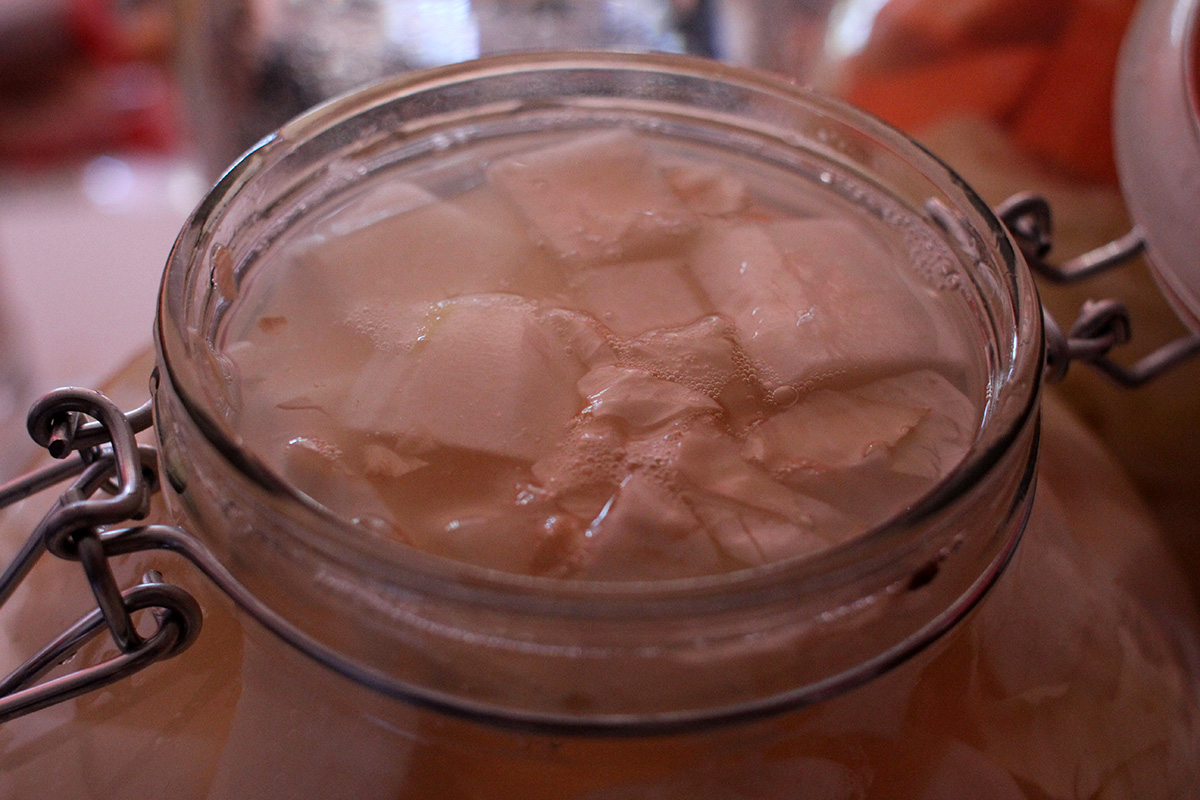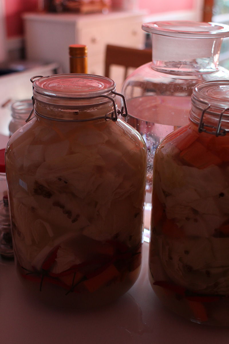 while admiring the jars of sichuan paocai fermenting on my kitchen counter, i noticed that one of the jars was leaking. apparently all that carbon dioxide had pushed up all that fermenting cabbage, which in turn pushed up the brine level, causing it to overflow despite the hermetic seal. this meant the jar closure isn't is actually hermetic, but i knew that going into this process, that at least some carbon dioxide would get released, preventing the jars from suddenly exploding if in fact the seal was airtight.