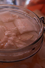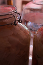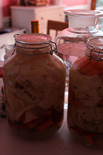 i opened up the jar and the paocai suddenly began to fizz like soda. next time, open the jar a bit more slowly. i spooned out enough brine to drop the water level before sealing the jar back up. i may have to "burp" these jars daily, in order to let out the excess carbon dioxide building up inside. but is that a good idea? xianglian told me that sichuan paocai should never been opened during the fermentation process, which for a new jar might take 2 weeks or longer. but if i don't burp the jars, the gases will simply push up all that paocai and overflow the jars.