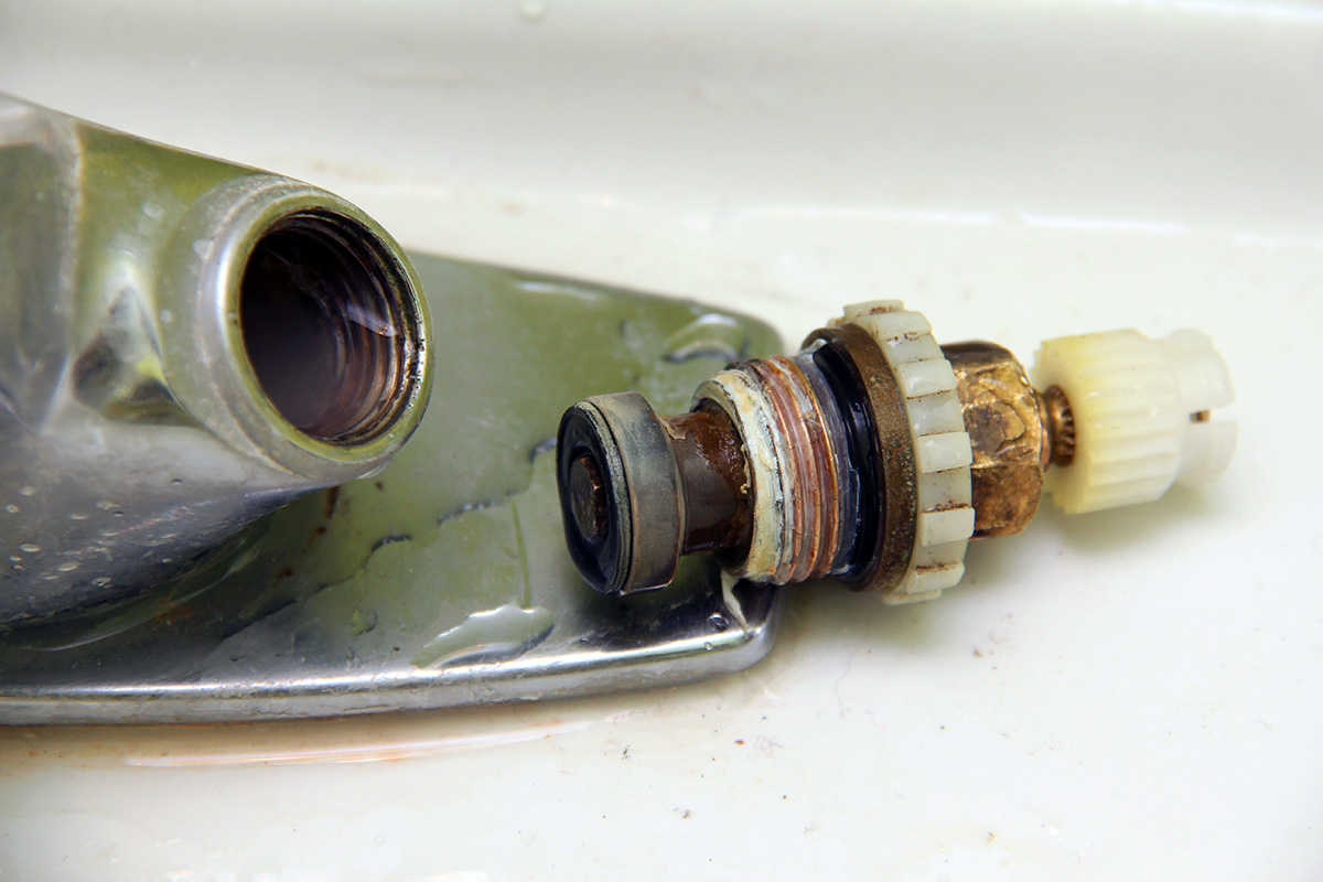 given that i can buy a whole new faucet set for $20-30, it may not be worth it trying to fix it. the one piece of equipment i need but don't have is a basin wrench, for releasing the faucet apparatus from the sink. but the basin nut in question has some corrosion issues, and might be difficult to remove even with the proper tool. regardless, once i pulled out the cartridge (from the cold water knob because it was a cold leak), i inspected it. the washer didn't seem all that bad, not completely vulcanized like the last time. there was a lot deposits though, which i scraped away with an awl. i reassembled the cartridge and put it back onto the faucet assembly. no luck, still dripping. i took it out and put it back again, but it was still leaking. now i have to think about whether to try and fix the faucet or simply get a new one.