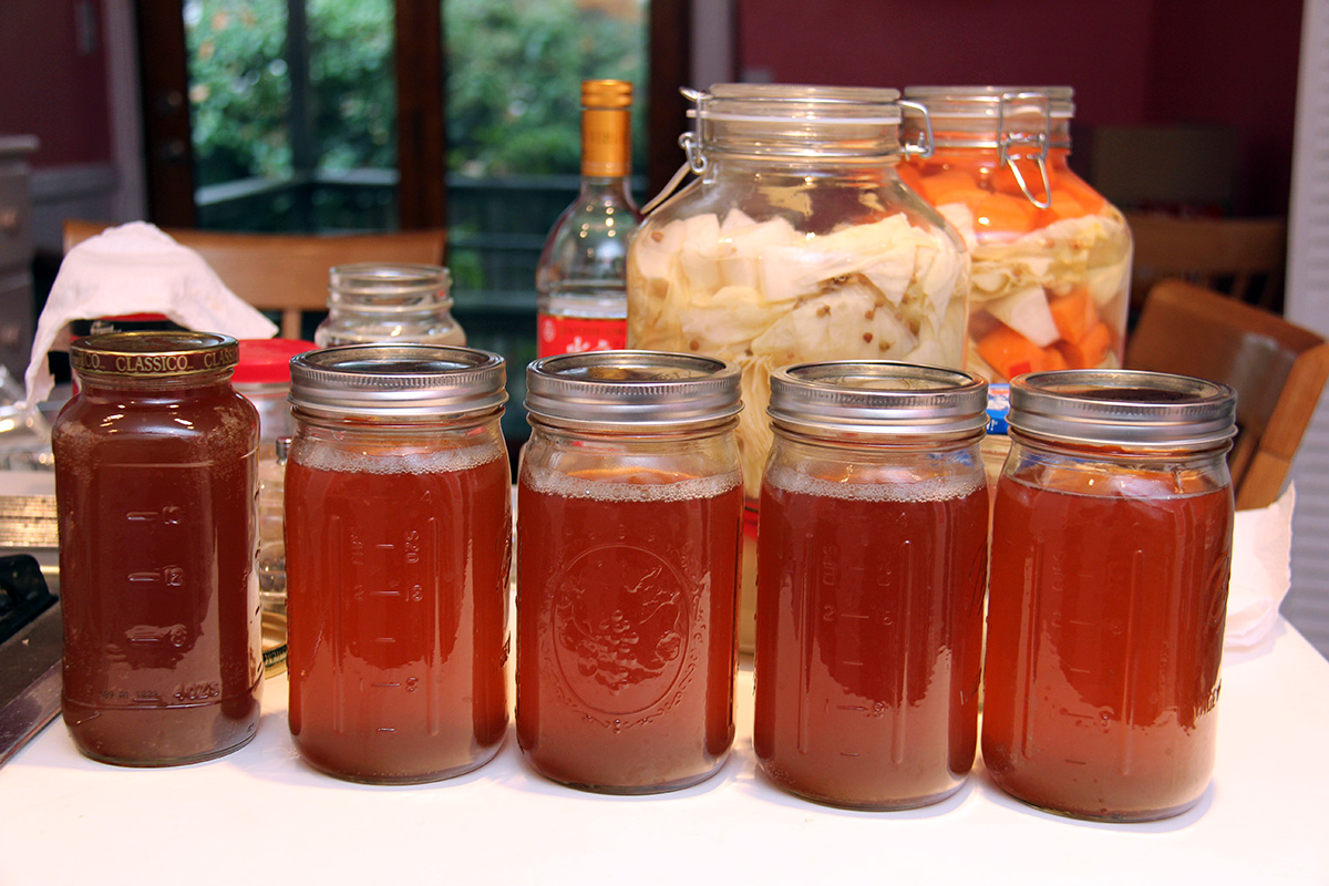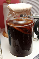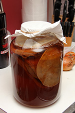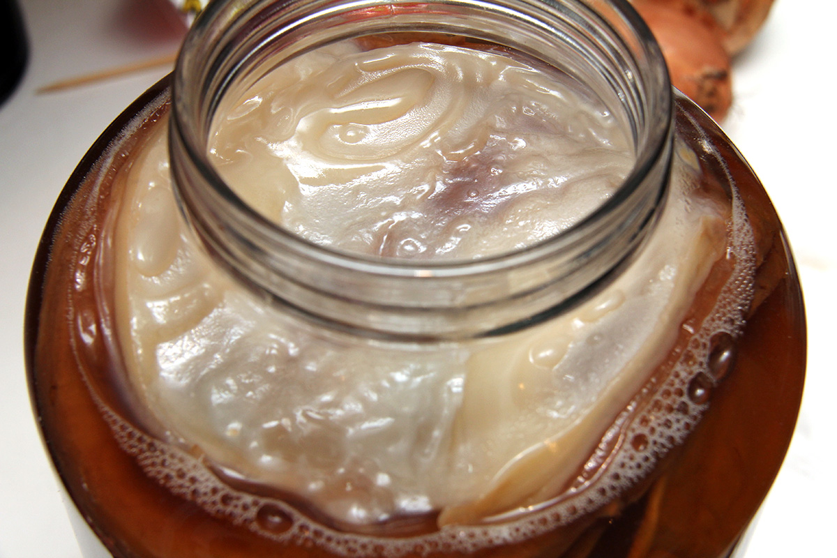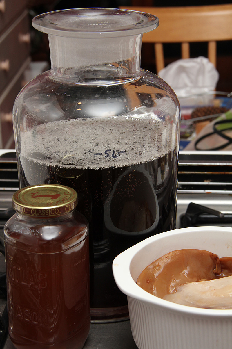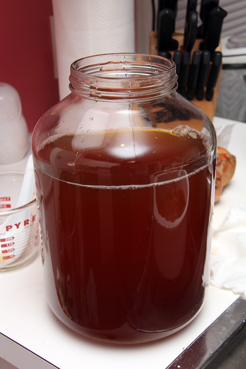 after 31 days, my kombucha ferment was finally ready. normally it wouldn't take this long, but this was a fresh batch using refrigerated scobies with no starter tea. even then, it still probably wasn't the strongest kombucha i could make, but that heady vinegary smell told me it was time to start a new batch.